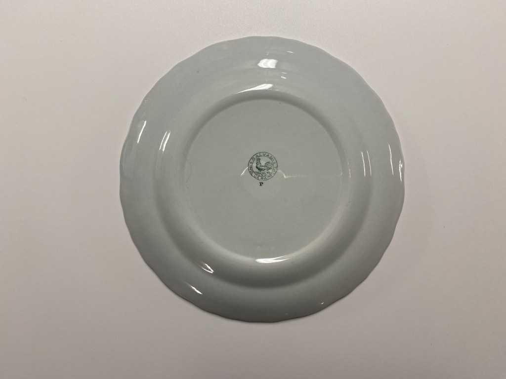 Piatto con ala in rilievo a raggiera e rocailles; in verde su fondo bianco. Sul retro marchio di fabbrica timbrato