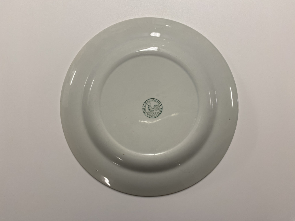Piatto con ala smerlata in rilievo, a raggiera e decoro floreale; in giallo e verde su fondo bianco. Sul retro marchio di fabbrica timbrato