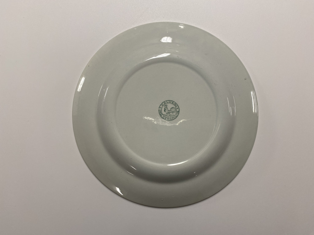 Piatto con ala smerlata in rilievo, a raggiera e decoro floreale; in verde e giallo su fondo bianco. Sul retro marchio di fabbrica timbrato