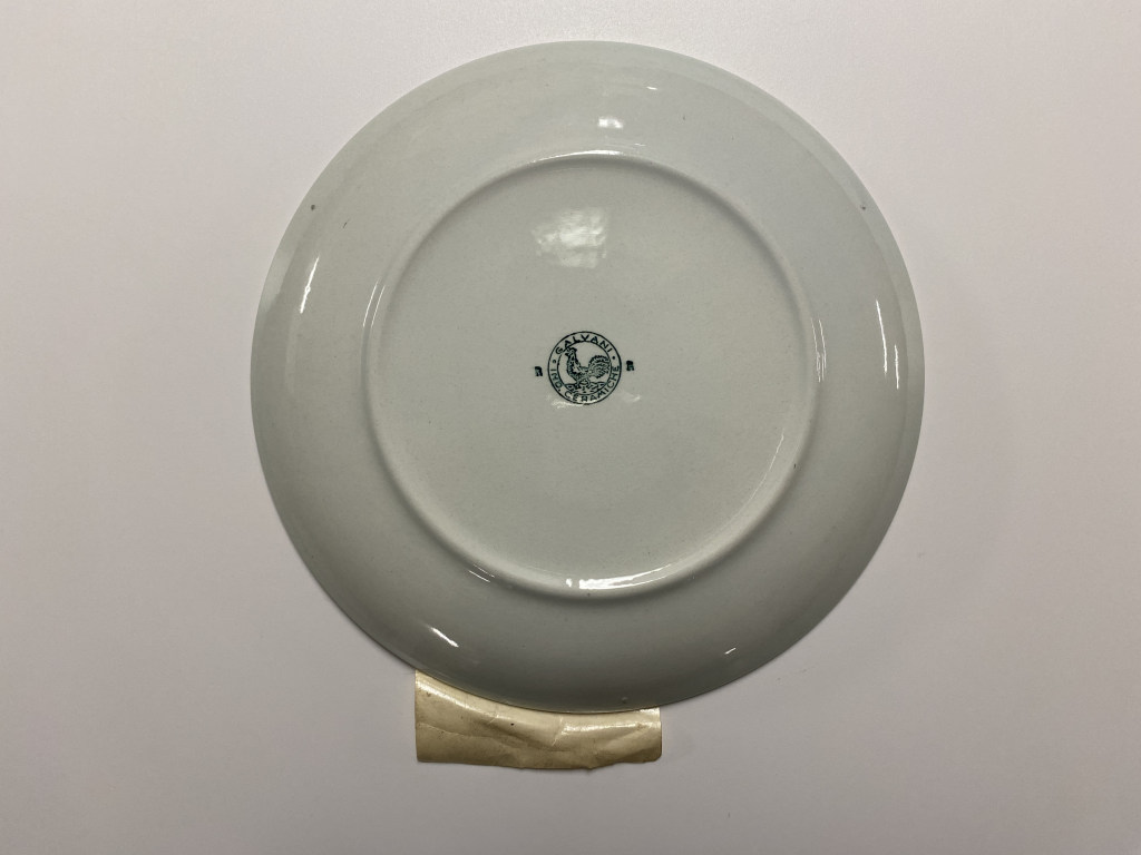 Piatto a calotta bassa. Decoro floreale totale: due mezze corolle sul bordo e un ramo di foglie trasverso; in rosso, blu e marrone su fondo bianco. Sul retro marchio di fabbrica timbrato