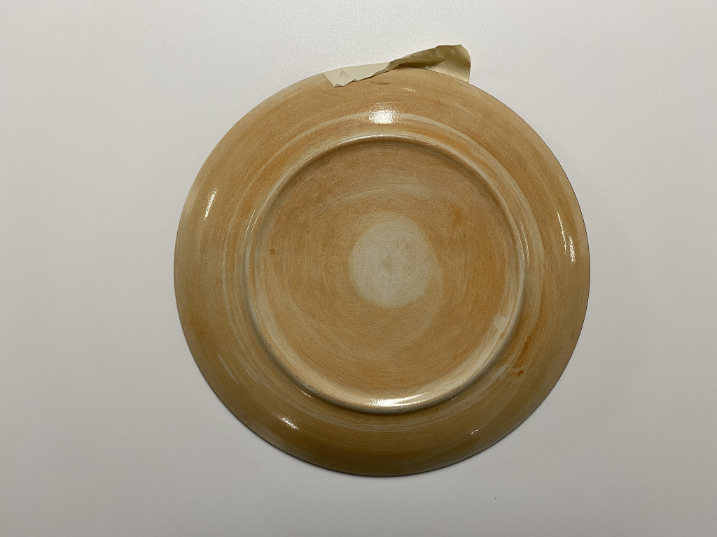 Piatto a calotta bassa. Decoro totale a cerchi concentrici; in vari toni di marrone su fondo camoscio