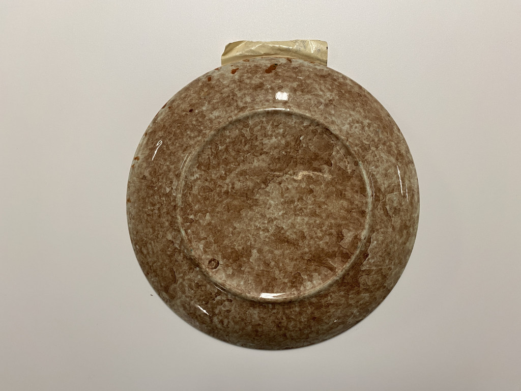 Piatto a calotta bassa; in giallo, ruggine e marrone su fondo bianco