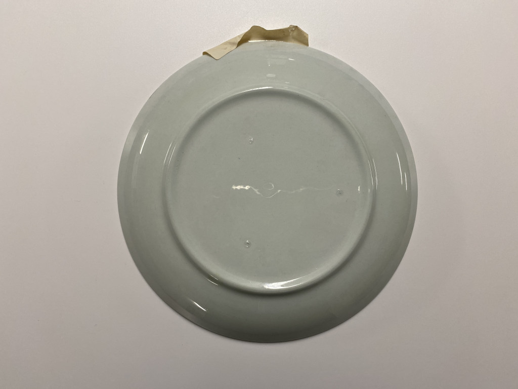 Piatto a calotta bassa; in giallo, ruggine, blu e verde su fondo bianco