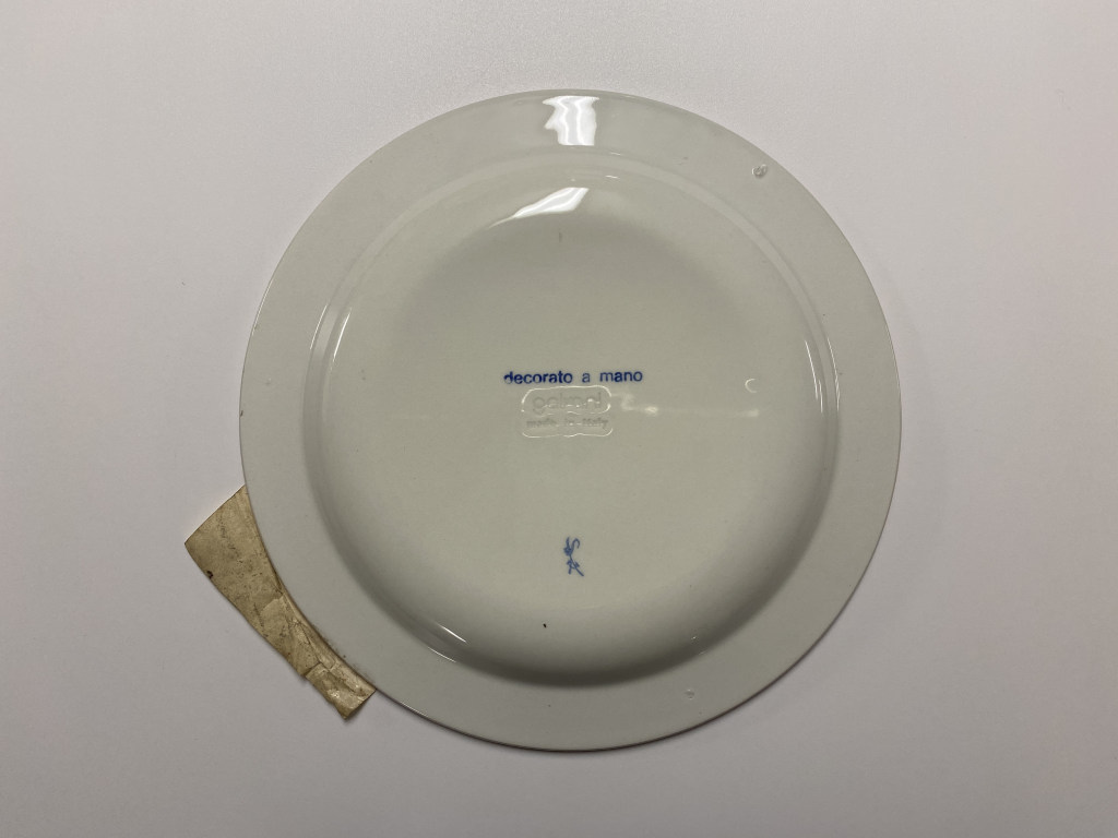 Piatto ad ala stretta, filettata. Decoro floreale nel cavetto; in rosa su fondo bianco. Sul retro marchio di fabbrica timbrato e marchio di fabbrica impresso