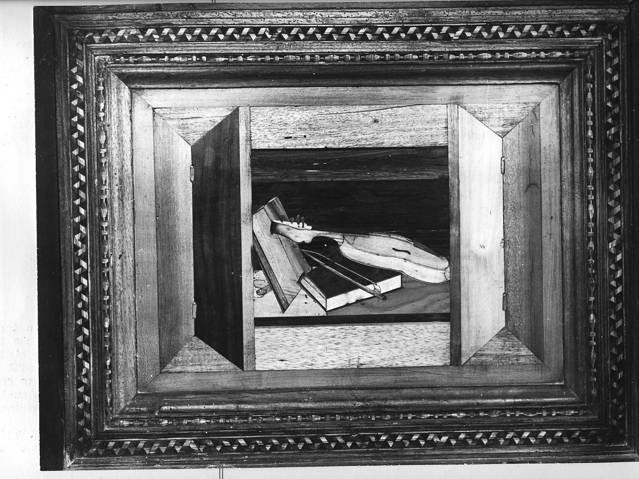 Violino e archetto poggiano su un libro chiuso. A sinistra un libro aperto su un leggio. Gli oggetti sono collocati entro una scansia visibile attraverso due sportelli semiaperti. Lo sportello di destra risulta più illuminato, mentre quello sinistro è in ombra