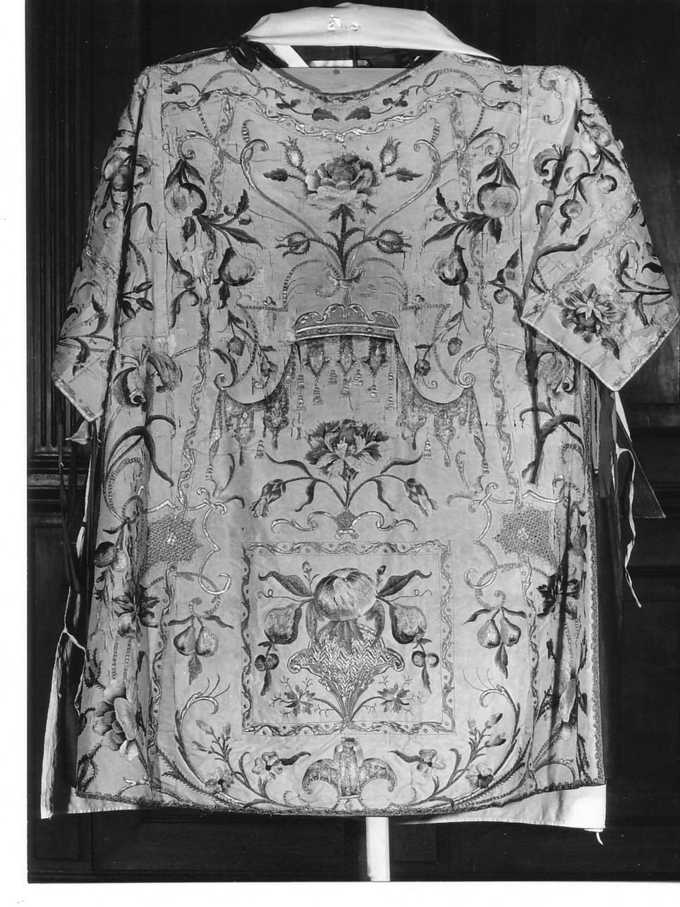 Taffetas bianca ricamata. Disegno: racemi con fiori e frutta policromi, intrecciati a fegri d'oro; al centro motivo a padiglione dorato. Ricami policromi a punto gobelin (bianco, giallo, verde, rosa, rosso, violaceo, marrone, azzurro nelle varie gradazioni) con lumeggiature i fili d'argento e d'oro. Il lavoro trapuntato d'oro è eseguito a punto gobelin e a punto piatto in tecnica parzialmente di applicazione con e senza imbottitura (cartone). Rari inserimenti in lamina d'oro e d'argento. Piccolo gallone dorato. Imbottitura in grezza tela bianca e rosa/ chiaro a trama larga; fodera in raso di seta cremisi. Un manipolo è provvisto di frange di filo d'oro