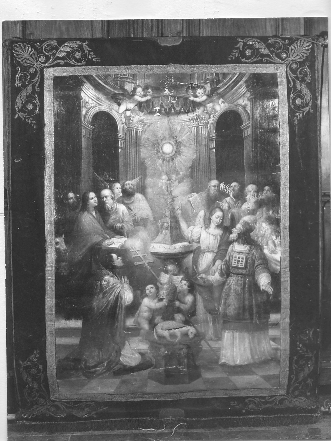 adorazione dell'Eucaristia tra evangelisti, profeti, il sacerdote Aronne e un papa