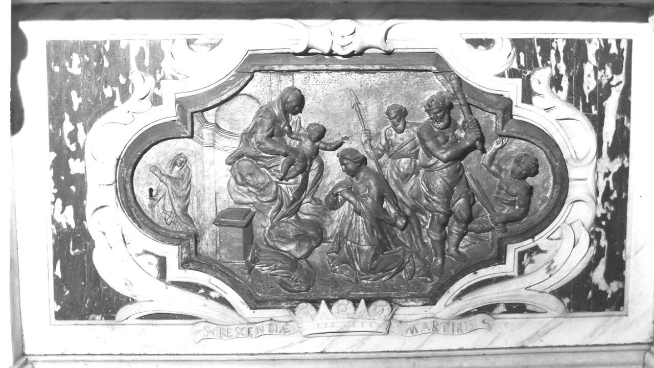 Il pannello, dalla cornice sagomata, racchiude il vano entro cui era posta la cassa con reliquie di S. Crescenzia. Vi è raffigurato il martirio della Santa, alla presenza della Vergine col Bambino
