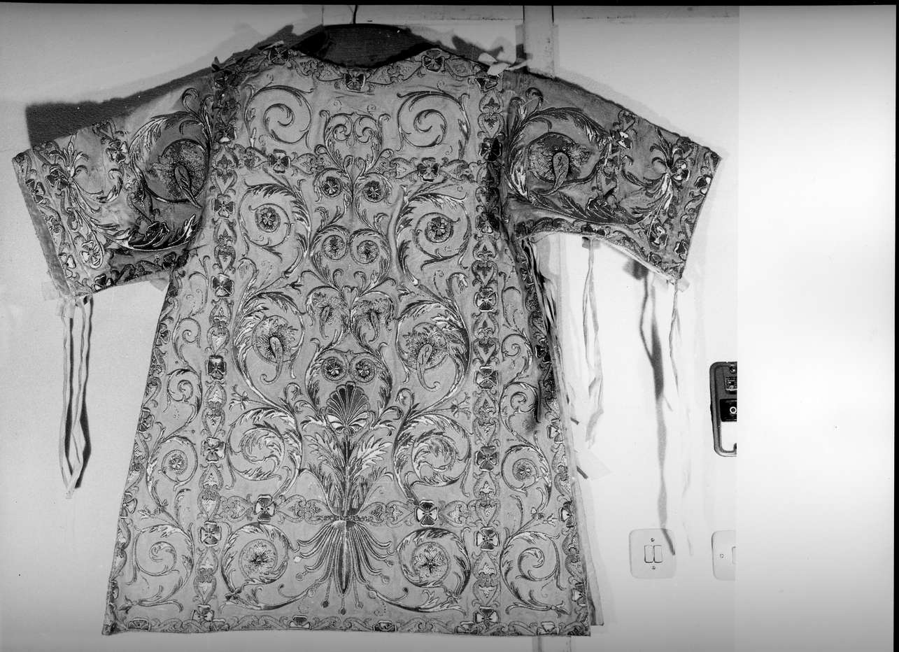 - NOTIZIE STORICO CRITICHE Il monogramma della Madonna che compare sul piviale e sulla pianeta, indica che il parato era dedicato alla Madonna.Il tipo di ricamo piuttosto pesante ed elaborato è caratteristico della seconda metà del sec. XIX. In particolare il parato è da porre probabilmente in relazione con l'indulgenza concessa dal Papa nel 1880 per la festa dell' Immacolata, nella navata sinistra della Chiesa