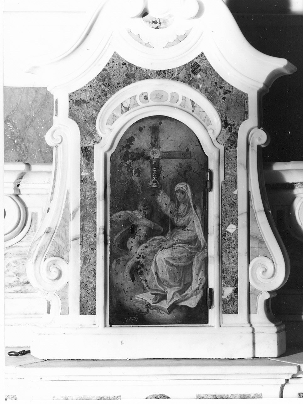 - NOTIZIE STORICO CRITICHE La porticina è probabilmente coeva al tabernacolo; il tipo di pennellata rapida e le lumeggiature sono, infatti, riconducibili al '700. La figura è rappresentata seduta. Ha veste bianca ampiamente panneggiata e chiaroscurata, la mano sinistra abbandonata in grembo e la destra in atto di reggere il calice con l'ostia; i piedi, con calzari ocra, poggiano su un volume aperto che schiaccia un drago dalle ampie spire. Sulla sinistra l'angioletto, con manto rosso, regge la croce al centro della quale è posta l'ostia collocata nel calice. Sullo sfondo cielo azzurro-verde e chiarore soffuso dietro la croce
