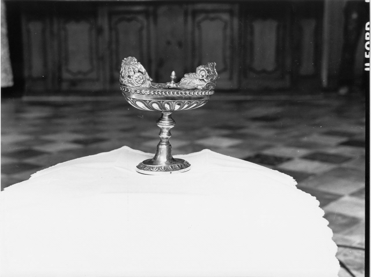 - NOTIZIE STORICO CRITICHE La presenza del punzone mauriziano data la navicella tra il 1824 e il 1868, anno in cui fu sostituito dal marchio con la testa di donna coronata; in particolare si può pensare a una datazione dopo la metà del secolo, allorchè i moduli neoclassici, con decorazione assai contenuta di tipo decorativo e vegetale, si fa più rigida e più appiattita, includendo nel repertorio anche elementi semplici e quasi banali, quali il fondo stellato del coperchio dello scafo. In un inventario del 1867, conservato nell'archivio parrocchiale, sono elencati un "turibolo per i giorni feriali e una navetta e cucchiaio"; non è possibile tuttavia identificare quale delle due navette sia quella in esame