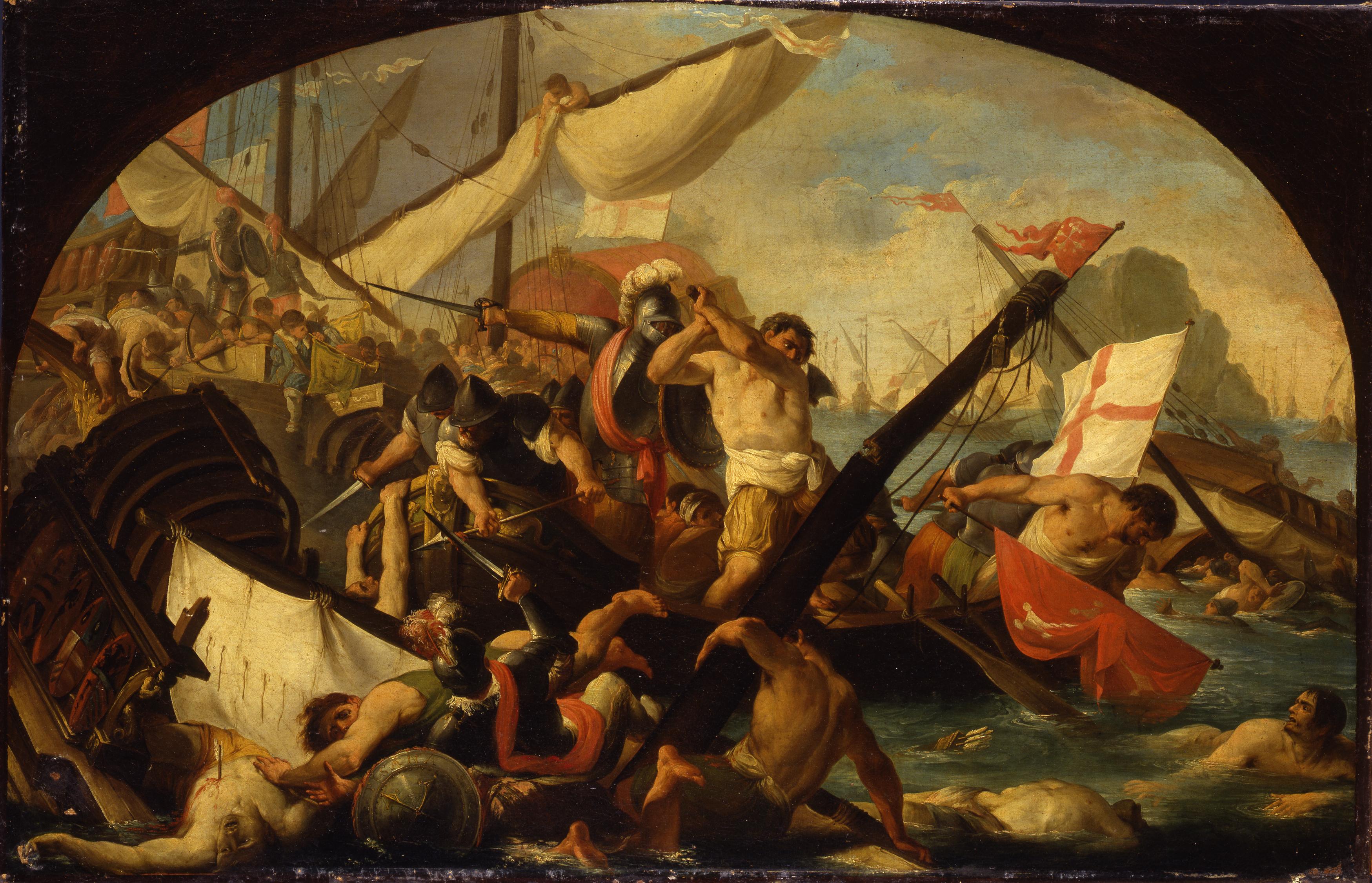 - NOTIZIE STORICO CRITICHE Si tratta di uno dei due bozzetti che Giovanni David eseguì in prova della decorazione della Sala del Maggior Consiglio a Palazzo Ducale e che poi gli fu in effetti affidata per quanto concerne il lunettone affrescato con questo episodio. Giovanni David, seguace di Gian Domenico Tiepolo, ne continua la tradizione decorativa che a Genova aveva importanti sostenitori. Abituato a un "vivere quasichè di palazzo" (Alizeri 1864-1866), interpretò tendenze conservatrici di "ornata celebrazione trasposta nella favola storica e mitologica" (Pesenti in Pittura a Genova e in Liguria, 1971, p. 404).Del dipinto è stata pubblicata una scheda specifica nel catalogo della mostra di F. Sborgi (1975, p. 49). L'autore nota nel quadro la presenza di influssi neoveneti e in particolare con l'opera di Gian Domenico Tiepolo (revisione Olcese C. 1985). Nel 2009, con la pubblicazione del catalogo delle collezioni di Palazzo Reale, L.Leoncini ne ripercorre la storia collezionistica e lo confronta con un disegno a matita nera, penna e inchiostro acquarellato , pennello e acquerello conservato al Metropolitan Museum of Art di New York. Dal confronto emergono due varianti : la galea sullo sfondo viene spostata nel dipinto sulla sinistra, concedendo così maggiore risalto alla figura principale di Oberto Doria . Altre modifiche intercorrono poi tra il bozzetto in esame e la tela finale , documentando, come sottolineato da Leoncini, un complesso processo creativo