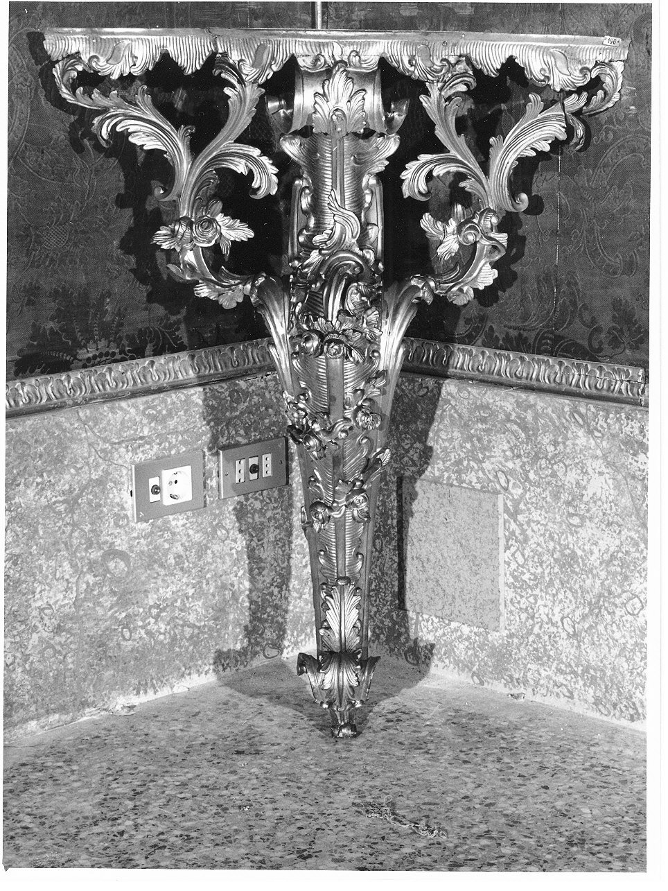 Piano ondulato in marmo africano. Piede a voluta e controvoluta, rilevato da ricchissima e opulenta decorazione floreale (foglie d'acanto, fiorellini), che si accartoccia su se stessa alle estremità. Alla metà del piede si dipartono due ramificazioni a foglie che si congiungono con la centina sagomata della console