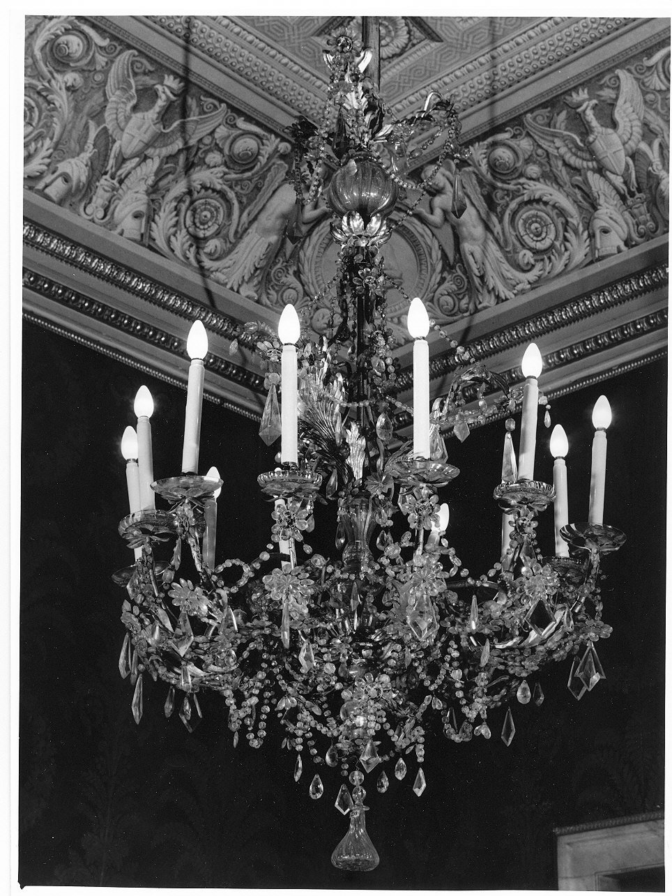 - NOTIZIE STORICO CRITICHE Le caratteristiche stilistiche (una certa pesantezza) e decorative (foglie d'acanto, lamina metallica dorata) alla fine XIX secolo.La dottoressa Olcese nella sua revisione del 1985 scrive: "pur riprendendo forme tipiche del XVIII secolo il lampadario è databile al XIX secolo, presumibilmente all'epoca in cui l'appartamento del Duca degli Abruzzi subì un intervento globale di risistemazione, in seguito all'acquisto del palazzo da parte dei Savoia"