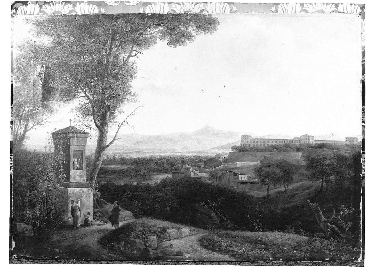 - NOTIZIE STORICO CRITICHE Il dipinto raffigura la collina nei dintorni di Moncalieri, di cui è peculiare il castello, visibile in secondo piano. Esso è riconducibile all'attività piemontese di Van Loo, protrattasi fino al 1794-95, e ne documenta la propensione programmatica per una pittura di paesaggio condotta "in presa diretta dalla natura su un sostrato disegnativo da vedutismo ottico settecentesco derivato dallo studio di Joseph Vernet" (cfr. P. Astrua, in Castelnuovo - Rosci, 1980). Nato nel 1743 a Parigi, Jules César Denis Van Loo soggiornò diversi anni in Italia, principalmente a Roma e presso la corte sabauda, in Piemonte. Nel 1793 il re Vittorio Amedeo III di Savoia gli aveva commissionato due vedute dei dintorni di Torino, oggi nelle collezioni della Galleria Sabauda di Torino, insieme ad altri dello stesso autore, simili a questo per dimensioni. E' possibile che l'opera oggetto di scheda potesse essere la capostipite del gruppo, essendo gli altri dipinti datati tra il 1793 e il 1794. La tela compare nell'inventario del 1854 nella camera d'entrata dell'alloggio nobile del primo piano a levante, ovvero l'Appartamento della Biblioteca, ma già nel 1950 è conservata nei depositi