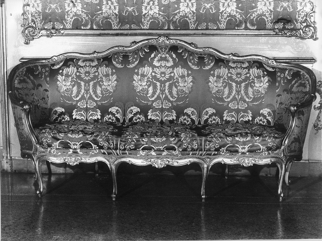 - NOTIZIE STORICO CRITICHE Per la forma della sua struttura con braccioli rientranti e curvi che costituiscono un tutt'uno con l'avvolgente schienale, il divano rientra nel tipo detto "a corbeille"; appartiene alla produzione del barocchetto genovese ed è stato pubblicato dal Morazzoni (1950) e dal Canonero (1962) che concordi lo hanno datate alla metà del XVIII secolo. L'imbottitura in lampasso è stata sostituita negli anni '50 del XX secolo con tessuti del XIX secolo conservati nei depositi del Palazzo