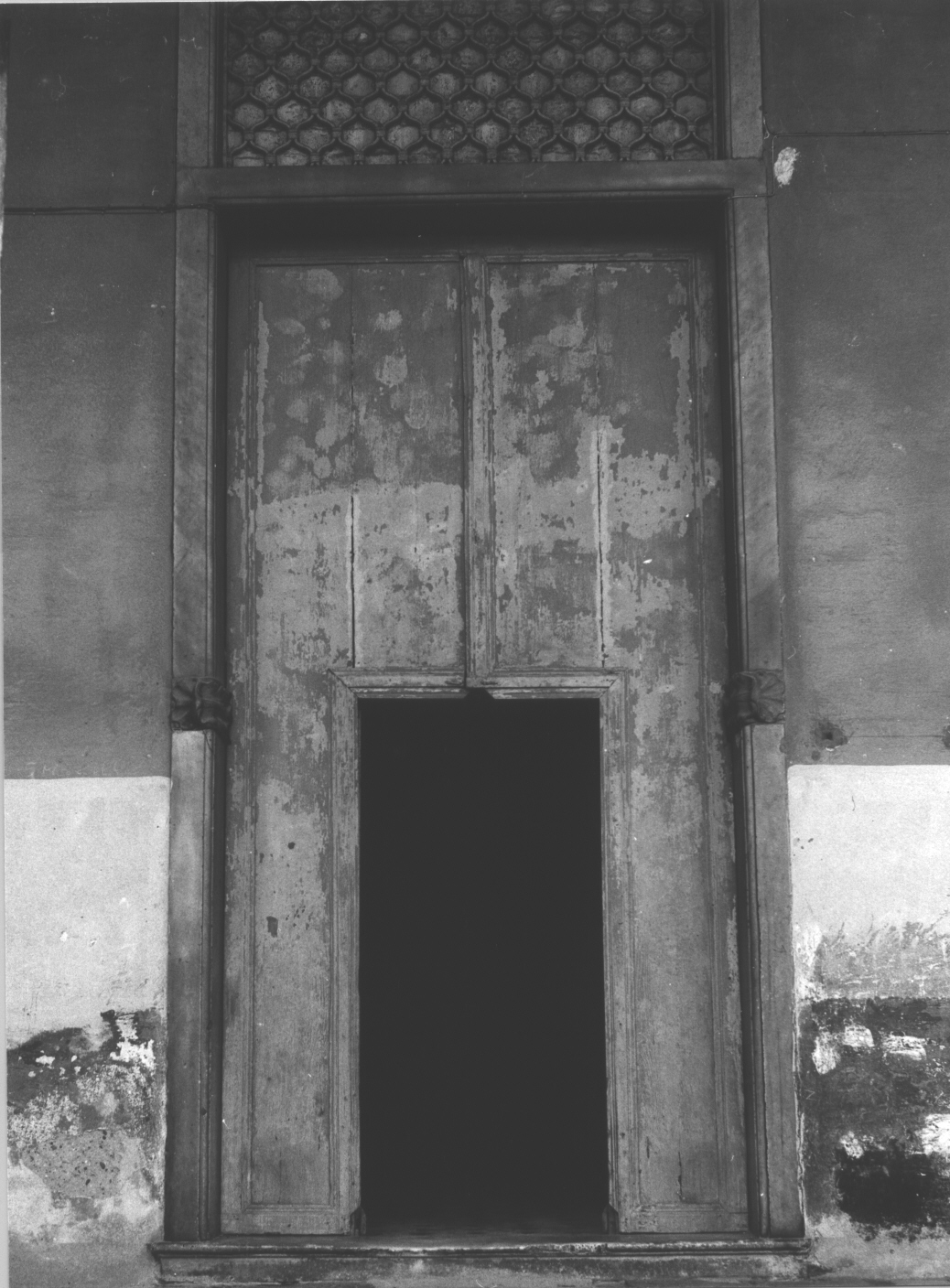 Il portale ha un'intelaiatura marmorea; gli stipiti sono ornati, in mezzo, da un fregio di fogliami stilizzati. Sopra l'architrave un'apertura rettangolare