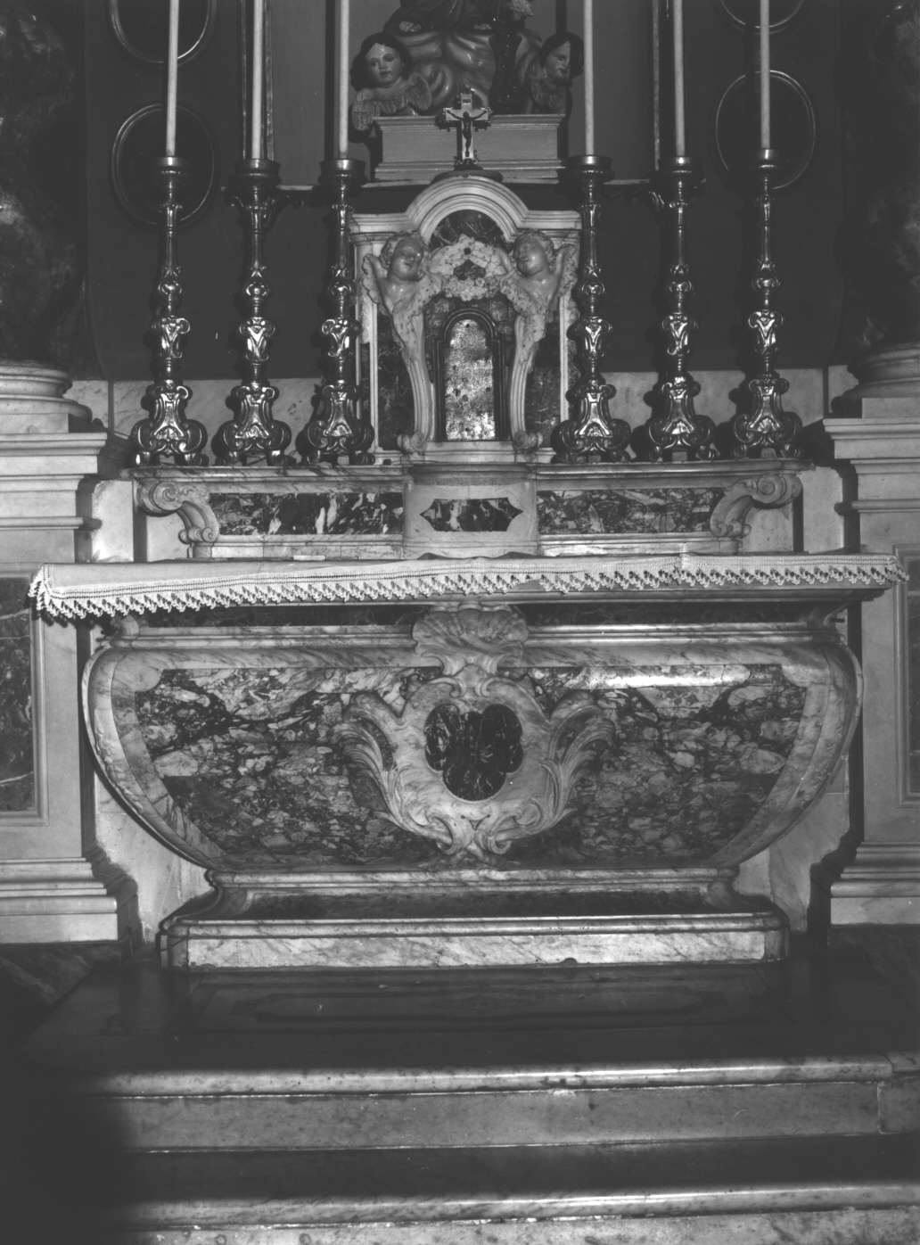 L'impianto architettonico dell'altare è formato da un paliotto bombato vaschiforme, con al centro una tarsia marmorea circondata da motivi fitomorfi con al di sopra una conchiglia. E' munito di riccioli laterali in corrispondenza del primo ed unico gradino. La parte inferiore è formata da un solo piede poggiante su due gradini marmorei. Si eleva sopra all'altare un tabernacolo, dotato di uno sportello ligneo dipinto; lo arricchisce il complesso di due angeli marmorei, uniti da una corda di roselline