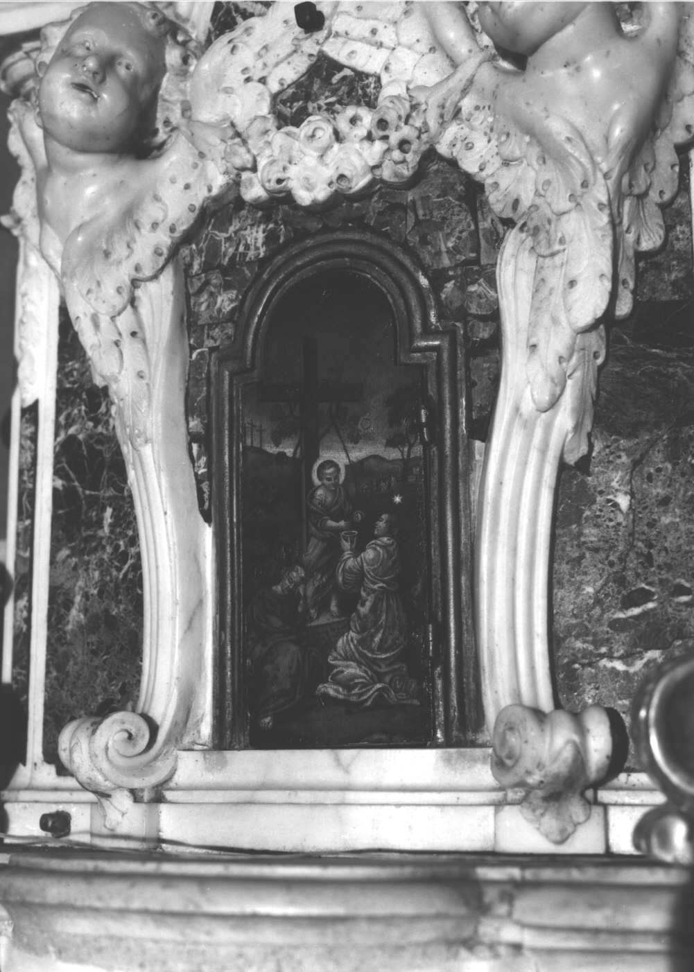 - NOTIZIE STORICO CRITICHE Il dipinto sembra influenzato dalla passione e moda per le chinoiseries (secoli XVII-XVIII): si notano infatti il taglio degli occhi delle figure decisamente orientali e gli abiti simili a kimono occidentalizzati. Grazie a questi elementi possiamo definire il tabernacolo settecentesco