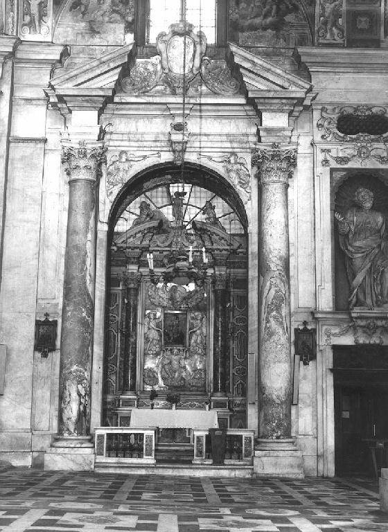 - NOTIZIE STORICO CRITICHE Il progetto di questa cappella, come delle altre della chiesa, è rigidamente concepito come uniforme già in sede progettuale (Parma Armani, 1988); così di ogni prospetto si ripete lo schema ancora manieristico e di preciso ricordo classico. L'effetto scenografico dell'insieme è dovuto anche al ripetersi dello stesso schema a colonne dell'interno e nella struttura dell'altare