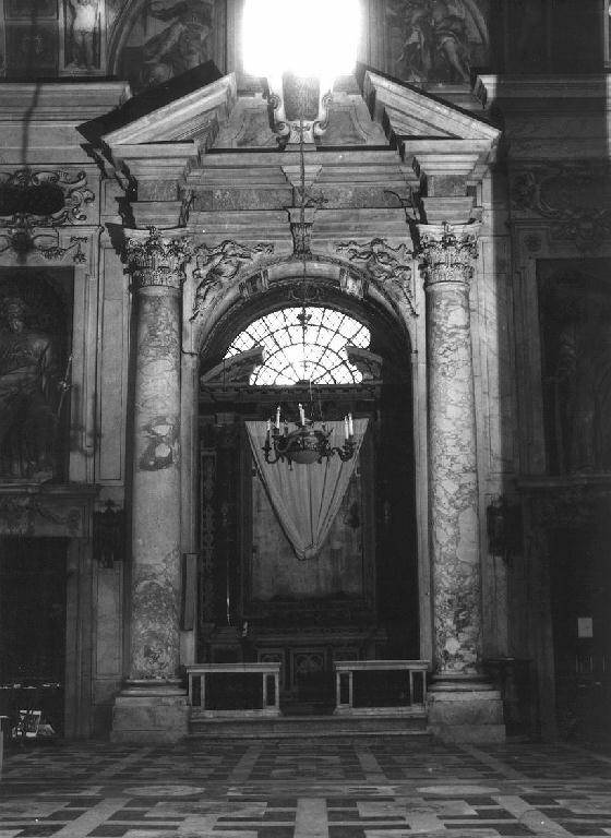 - NOTIZIE STORICO CRITICHE il progetto della chiesa è attribuito al Vannone (Boggero, 1977). Il prospetto di questa come delle altre cappelle è rigidamente vincolato all'uniformità già in sede progettuale (Parma Armani, 1988). Così in ogni prospetto si ripete lo schema ancora umanistico delle elastiche colonne che reggono capitelli classici. L'effetto scenografico è dato anche dal ripetersi dello schema a colonne in piccolo sulla struttura dell'altare. La cappella fu commissionata dai Teatini per Alberico Cybo in cambio della sua rinuncia al patronato sul Sancta Sanctorum e iniziata nel 1601 (Boggero, 1977; Lodi 1992)