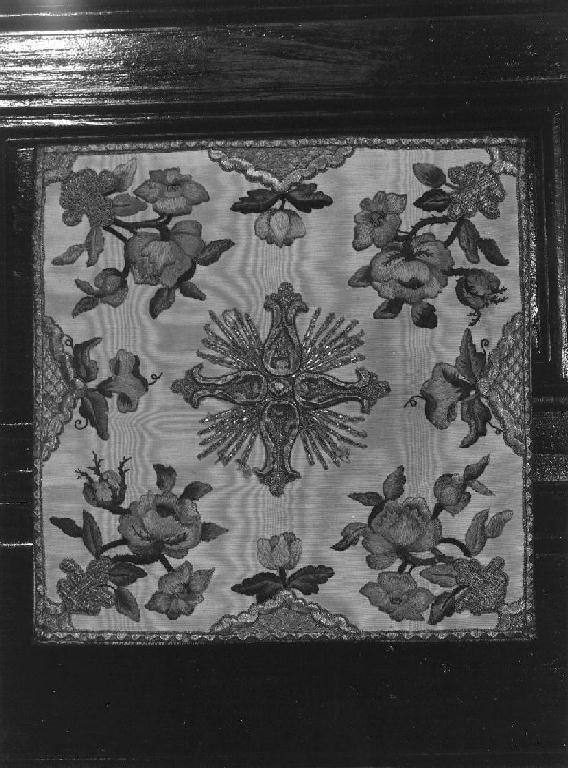 BORSA.GROS DE TOURS (CREMA) MAREZZATO/ RICAMATO (RICAMO RIPORTATO) FILO D'ORO (FILATO) FILO DI SETA (ROSA/ VERDE/ VIOLA/ AZZURRO SFUMATI).FODERA TELA DI COTONE (ROSSO)
