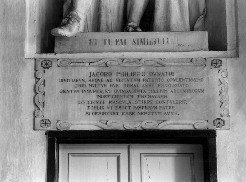 - ISCRIZIONI JACOBO PHILIPPO DURATIO/ DIVITIARUM, AEQUE AC VIRTUTUM PATRITIO OPULENTISSIMO/ QUOD MULTUM HUIC DOMUI AERE PRAELEGATO/ GENTUM INSUPER, ET QUINQAGINTA MILLIUM ARGENTEORUM/ INDEFICIENTEM THESAURUM/ DEFICIENTE MASCULA STIRPE CONTULERIT./ FOELIX UT ESSET PAUPERUM PATER/ SI DESINERET ESSE NEPOTUM AVUS - lettere capitali -
