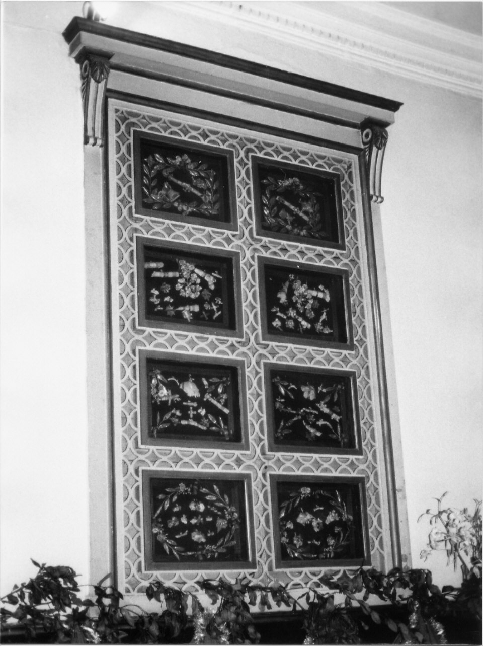 Grande reliquiario rettangolare incassato nel muro longitudinalmente e realizzato in legno dipinto, consta di una cornice con cimasa su due volute laterali che include otto riquadri rettangolari con teca in vetro, entro un graticcio ligneo a cerchi e semicerchi. Fra le reliquie si notano i nomi dei Santi Nerio, Plinio, Fabiano, Massimiano, Claudio etc.
