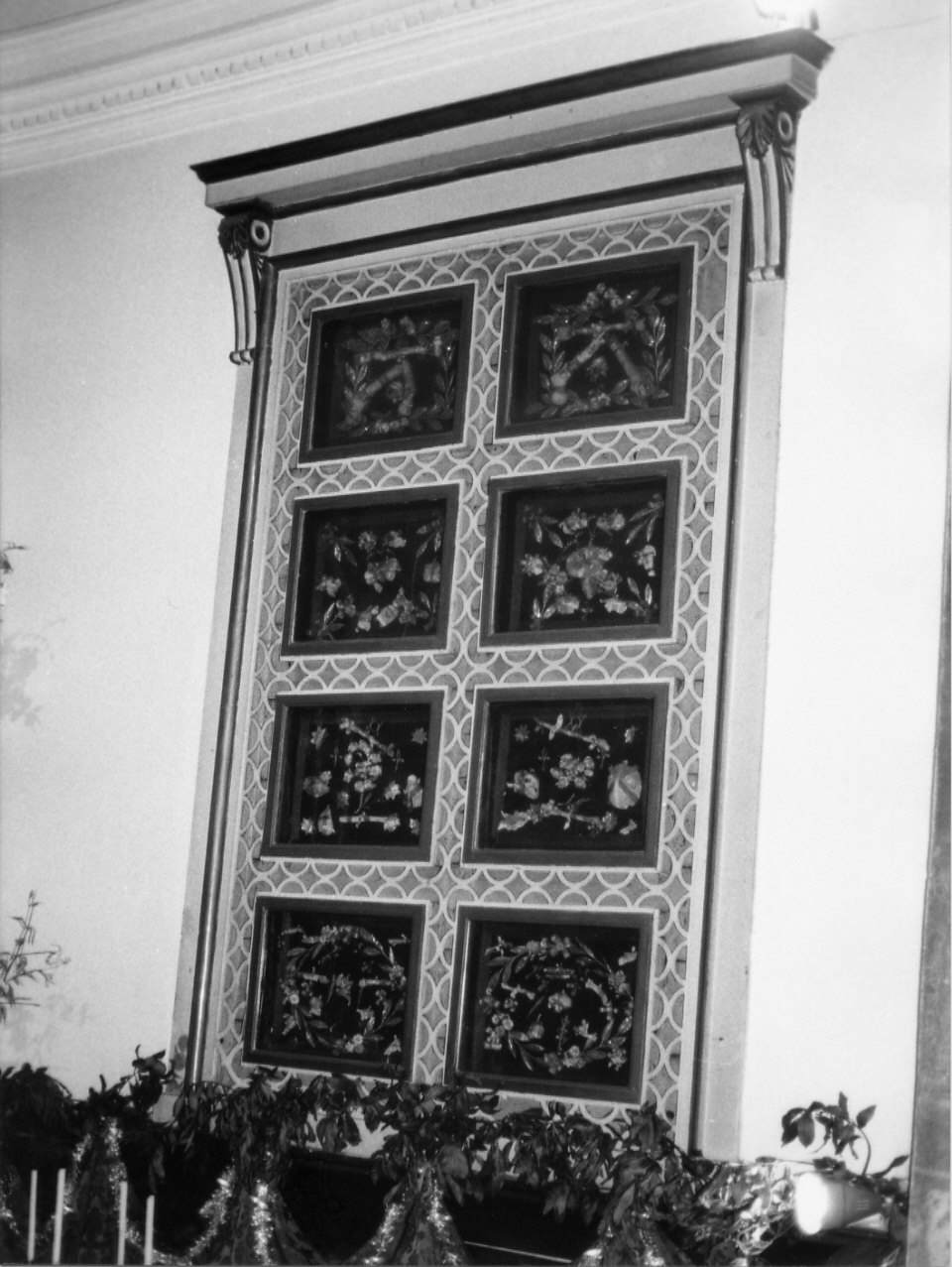 Grande reliquiario rettangolare incassato nel muro longitudinalmente e realizzato in legno dipinto, consta di una cornice con cimasa su due volute laterali che include otto riquadri rettangolari con teca in vetro, entro un graticcio ligneo a cerchi e semicerchi. Fra le reliquie si notano i nomi dei Santi Giulio M., Vittoria e Rosa, Claudio etc..