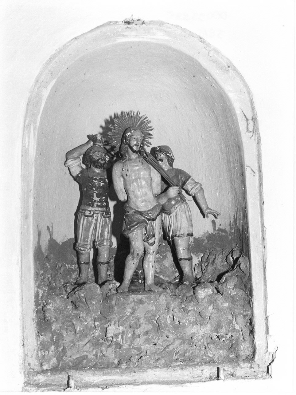 - NOTIZIE STORICO CRITICHE LA PICCOLA SCULTURA RIENTRA NELL'AMBITO DELLA PRODUZIONE POPOLARE DELLA CERAMICA SAVONESE E DI ALBISOLA. DELLA SECONDA META' DELL'800, ACCANTO ALLA PRODUZIONE DI STATUINE PER IL PRESEPE, VENIVANO ESEGUITI PICCOLI GRUPPI RIPRODUCENTI IMMAGINI SACRE E, SOPRATTUTTO, LE "CASSE" DELLE CONFRATERNITE PORTATE IN PROCESSIONE IL VENERDI' SANTO. TALI GRUPPI ERANO SPESSO PROTETTI DA TECHE O CAMPANE DI VETRO O, COME IN QUESTO CASO, SISTEMATI IN NICCHIE. SI TRATTA DI UNA FORMA DI DEVOZIONE POPOLARE CHE SI AFFIANCA ALL'OPERA DI APOSTOLATO NEI CETI MENO ABBIENTI INTRAPRESA DALL'ORDINE CAPPUCCINO