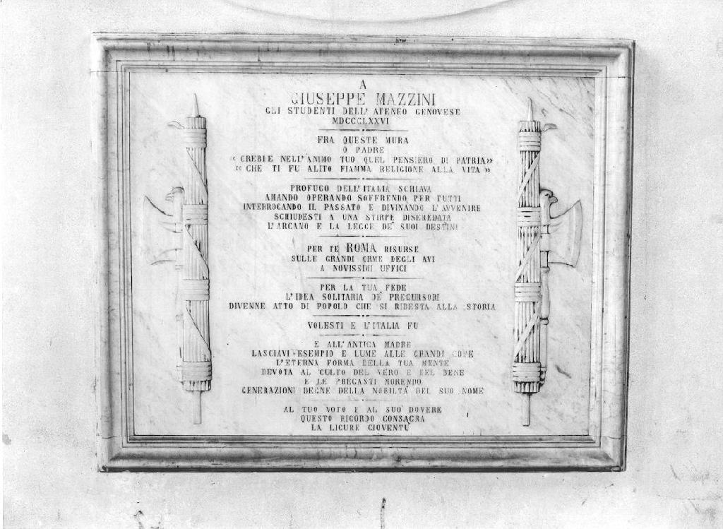 - ISCRIZIONI CENTRO - A/ GIUSEOOE MAZZINI/ GLI STUDENTI DELL'ATENEO GENOVESE/ MDCCCLXXVI/ FRA QUESTE MURA/ O PADRE/ "CREBBE NELL'ANIMO TUO QUEL PENSIERO DI PATRIA"/ "CHE TI FU ALITO FIAMMA RELIGIONE ALLA VITA"/ PROFUGO DELL'ITALIA SCHIAVA/ AMANDO OPERANDO SOFFRENDO PER TUTTI/ INTERROGANDO IL PASSATO E DIVINANDO L'AVVENIRE/ SCHIUDESTI UN UNA STIRPE DISEREDATA/ L'ARCANO E LA LEGGE DE' SUOI DESTINI/ PER TE ROMA RISURSE SULLE GRANDI ORME DEGLI AVI A NOVISSIMI UFFICI/ PER LA TUA FEDE L'IDEA SOLITARIA DE' PRECURSOR/ DIVENNE ATTO DI POPOLO CHE SI RIDESTA ALLA STORIA/ VOLESTI E L'ITALIA FU/ E ALL'ANTICA MADRE/ LASCIAVO ESEMPIO E LUME ALLE GRANDI COSE/ L'ETERNA FORMA DELLA TUA MENTE/ DEVOTA AL CULTO DEL VERO E DEL BENE/ E LE PREGASTI MORENDO/ GENERAZIONI DEGNE DELLA NOBILTA' DEL SUO NOME/ AL TUO VOTO E AL SUO DOVERE/ QUESTO RICORDO CONSACRA LA LIGURE GIOVENTU' - lettere capitali - a incisione -