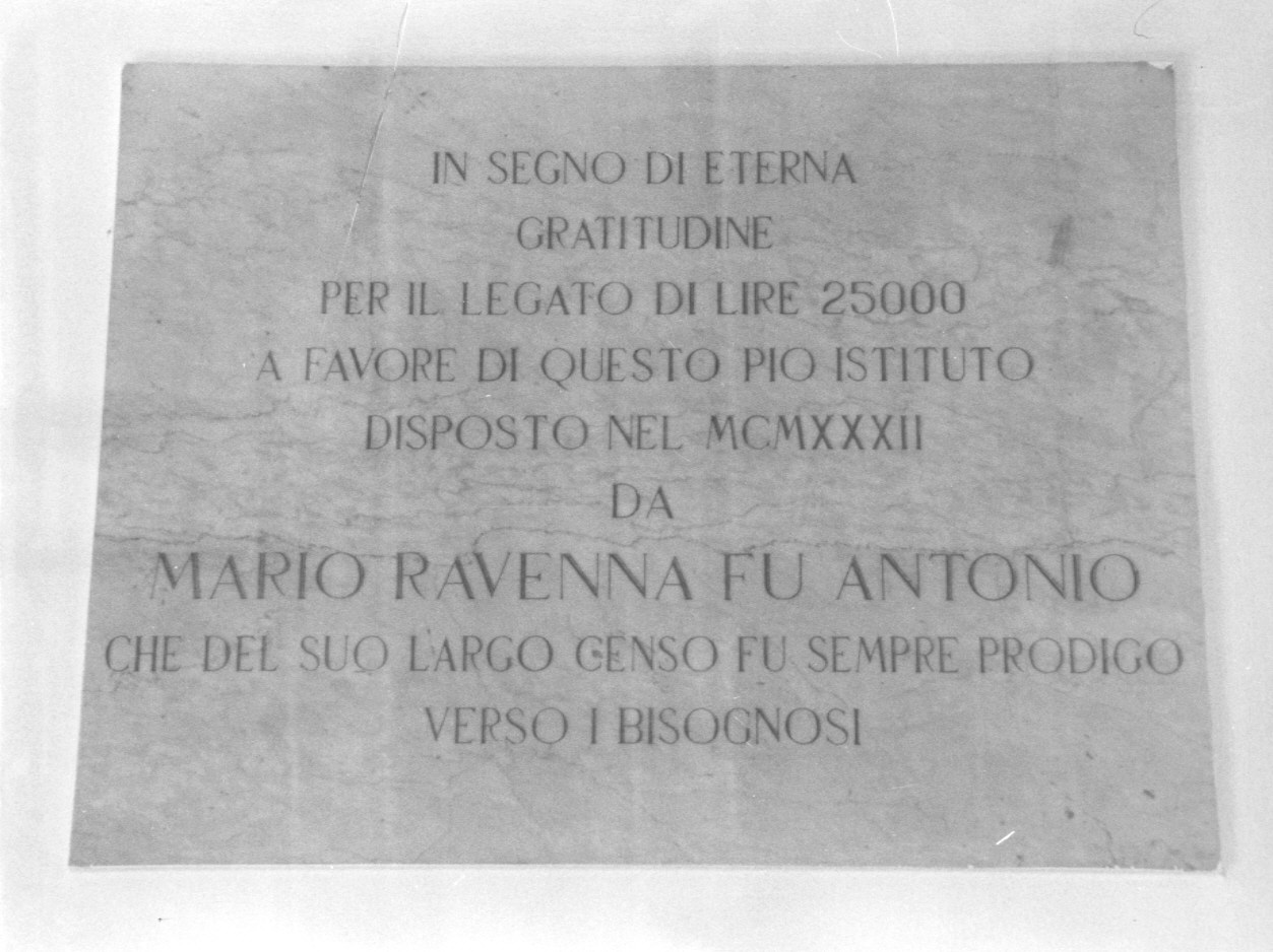 - ISCRIZIONI SULLA TARGA - IN SEGNO DI ETERNA/ GRATITUDINE/ PER IL LEGATO DI LIRE 25.000/ A FAVORE DI QUESTO PIO ISTITUTO/ DISPOSTO NEL MCMXXXII/ DA/ MARIO RAVENNA FU ANTONIO/ CHE DEL SUO LARGO CENSO FU SEMPRE PRODIGO VERSO I BISOGNOSI - lettere capitali - a solchi -