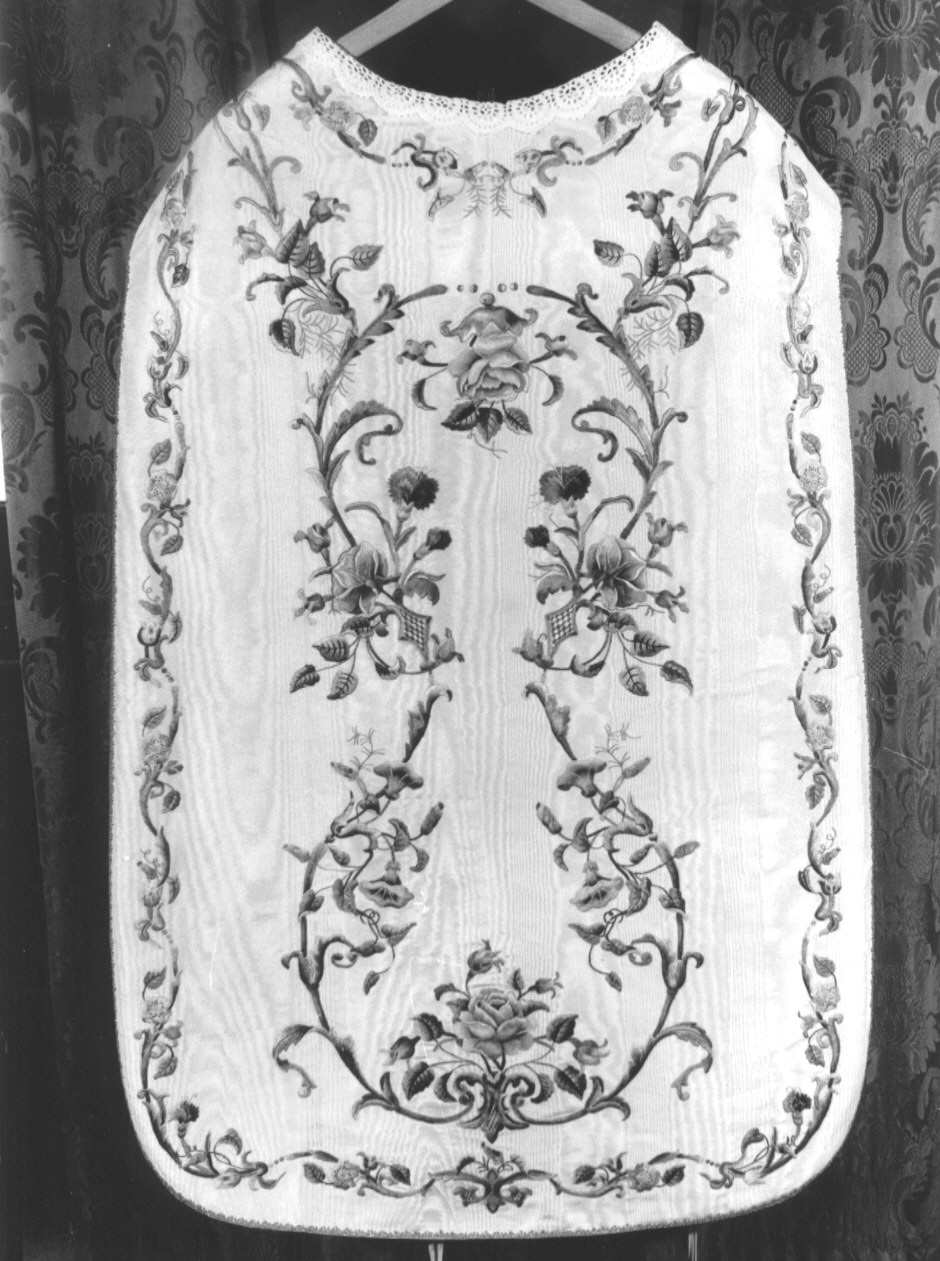 - NOTIZIE STORICO CRITICHE I RICAMI IN FILO DI SETA POLICROMA E FILO D'ORO, REALIZZATI IN UN PERIODO COMPRESO TRA LA FINE DEL SEC. XIX E L'INIZIO DEL SEC. XX, SONO STATI APPLICATI SU UN TESSUTO PIU' RECENTE, SOSTITUTIVO DI QUELLO ORIGINALE, PROBABILMENTE CONSUNTO. IL NUOVO TESSUTO DI FONDO (META' SEC. XX), IN GROS DE TOURS MAREZZATO OCRA, CREA UN MOTIVO DECORATIVO VERTICALE A RIGATURE CON ANDAMENTO SINUOSO