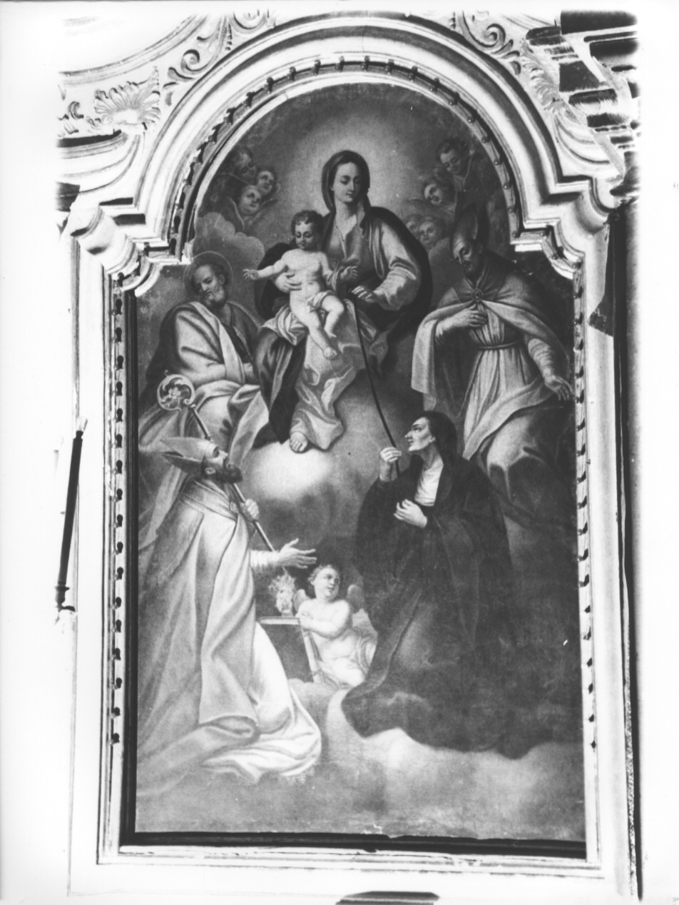 Personaggi: Madonna/ gesu' bambino/ San bartolomeo/ sant'agostino/ San martino/ santa monica; figure: angeli; attributi: (san bartolomeo) coltello; (sant'agostino) mitra/ pastorale/ angelo con conchiglia; (santa monica) vesti monacali/ cintura; abbigliamento religioso