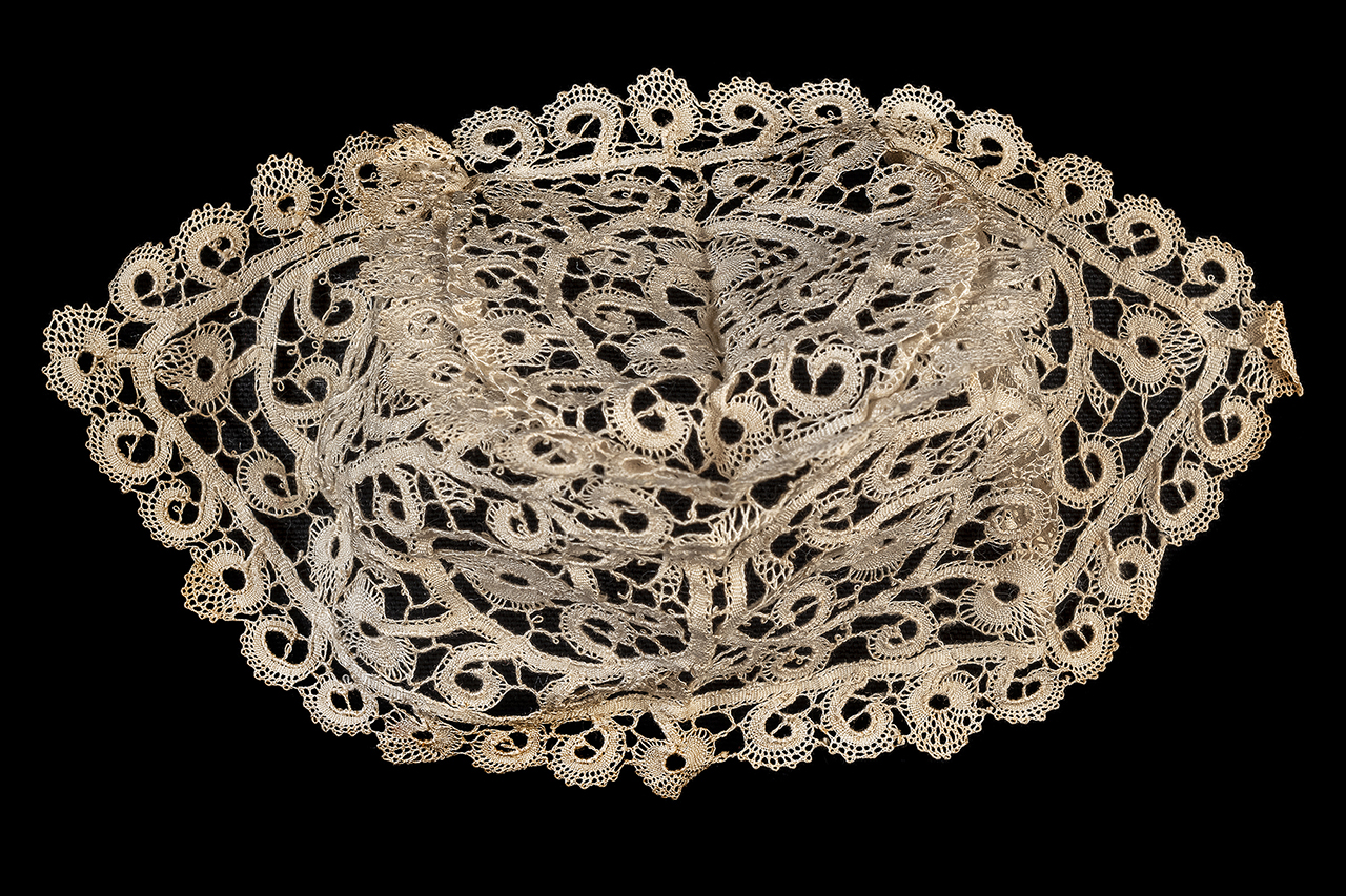 - NOTIZIE STORICO CRITICHE Connotata da un disegno elegante e ben eseguito, la cuffietta è databile in via ipotetica al XVIII secolo, epoca cui rimanda la tipologia del decoro del merletto, anche se non si esclude una datazione più tarda. Il manufatto è stato donato dalla famiglia Belloni nel 2004 alla Soprintendenza per il patrimonio storico artistico ed etnoantropologico della Liguria, insieme ad altri capi da neonato e da bambino