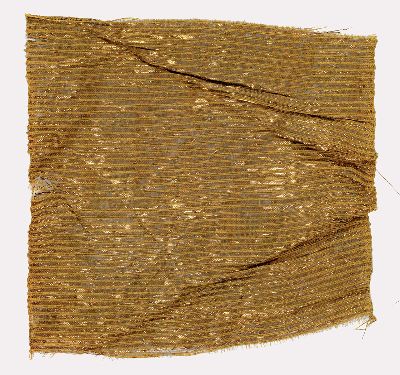 Tela (ordito in seta verde acido, trama in canapa giallo-verde acido a fili doppi variante trama in rame dorato lamellare). Effetto di sottili righe orizzontali (tipo baiadera) per trama variante nei materiali (due colpi canapa giallo-verde acido alternati a tre colpi rame dorato lamellare). Effetto di garza per bassa riduzione degli orditi