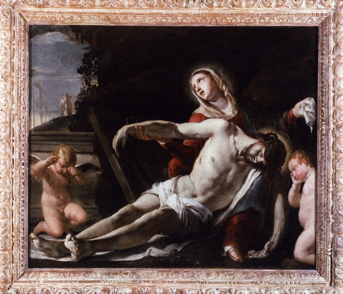 - NOTIZIE STORICO CRITICHE IL DIPINTO, GIA' PUBBLICATO DA ROBERTO LONGHI, E' ATTRIBUITO DA PESENTI A GIO. ANDREA ANSALDO, E DATATO VERSO LA FINE DEL TERZO DECENNIO DEL SECOLO. UN CONFRONTO CON LA PIETA' DELL'ACCADEMIA LIGUSTICA DI GENOVA DELLO STESSO ARTISTA PERMETTE, IN EFFETTI, DI RILEVARNE LE SOMIGLIANZE NELLA FIGURA DEL CRISTO. PESENTI AGGIUNGE CHE PER LE DIMENSIONI PIU' RIDOTTE E PER LE IMMAGINI PIU' ICASTICHE, QUESTA PIETA' ANCORA MEGLIO DICHIARA IL PERCORSO DELL'ANSALDO NELL'IMPOSTAZIONE DRAMMATICA DELLE FIGURE: L'ARTISTA CONIUGA NEL DIPINTO LA TEMPERIE EMOTIVA E L'EMERGERE DELLA LUCE, SECONDO LA LEZIONE DEI LOMBARDI COME MORAZZONE, CON L'ATMOSFERA SOFFUSA E LE TENEREZZE COLORISTICHE DI VAN DYCK.PARTICOLARE E' POI LA STRUTTURA COMPOSITIVA DEL DIPINTO, CHE AGGIUNGE ALLA TIPICA FIGURA DEVOZIONALE DELLA PIETA', CON IL CRISTO SORRETTO DALLA MADONNA, LA PICCOLA SCENA, SULLO SFONDO A SINISTRA, DELLE FIGURE PROBABILMENTE DI GIOVANNI E DELLA MADDALENA NEI PRESSI DELLA CROCE, DOPO LA DEPOSIZIONE DEL CRISTO. DUE ANGELI ARRICCHISCONO ULTERIORMENTE LA SCENA