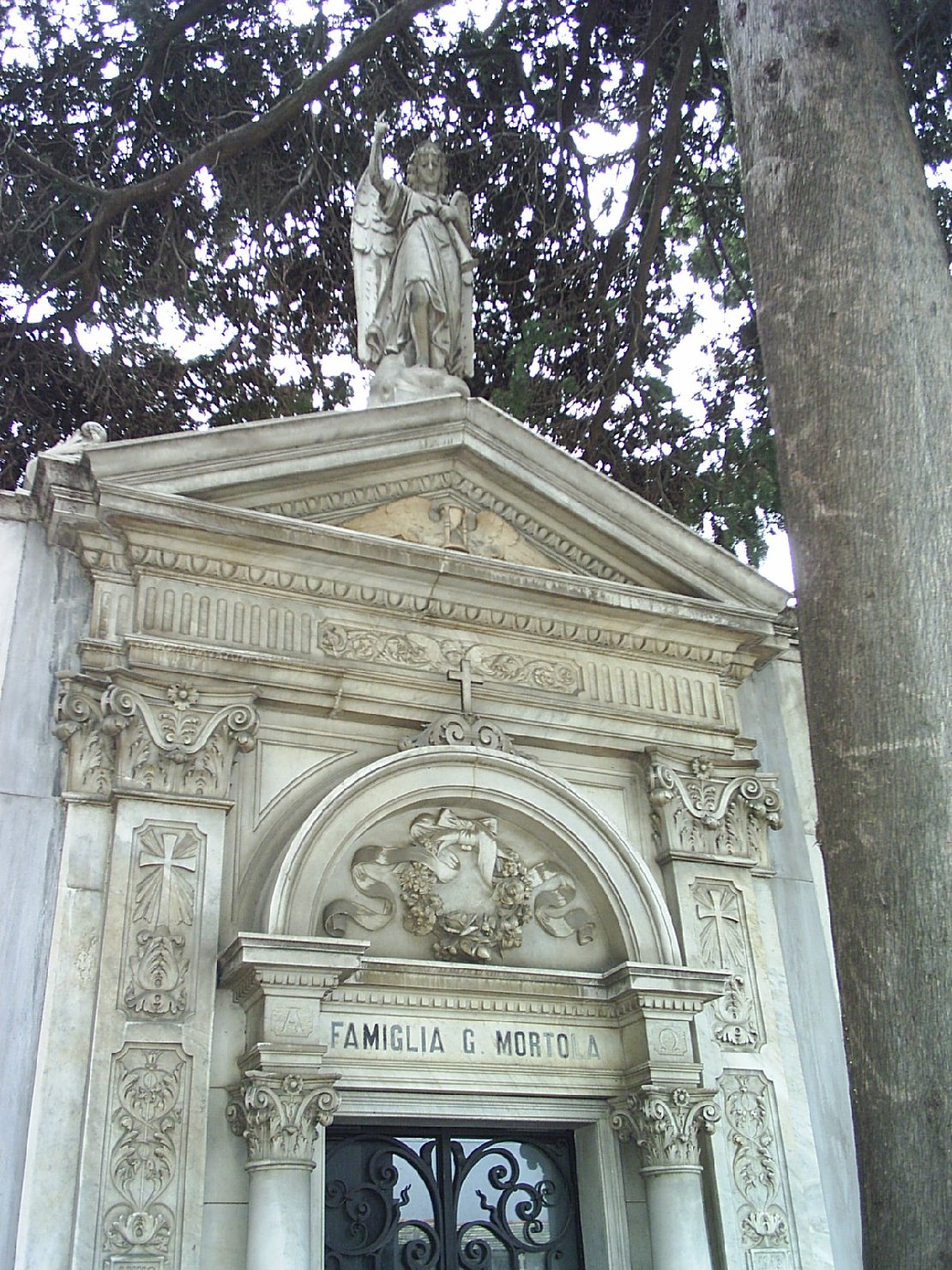 - NOTIZIE STORICO CRITICHE La cappella della famiglia G. Mortola, è caratterizzata dalla particolare ricchezza decorativa della facciata, che non trova corrispondenza nei fianchi lasciati allo stato grezzo. Il monumento reca la firma della ditta che lo ha realizzato, la Bianchi e Sanguineti di Lavagna, attiva dagli anni '60 dell'Ottocento e dedita al commercio di marmi lavorati soprattutto oltreoceano, come ricorda Franco Sborgi, "la ditta realizzò l'arredo plastico di intere chiese del Sud America (nella chiesa di La Guada ad esempio, realizzò ben undici altari) ". (Vedi F. SBORGI, La diffusione della scultura ligure all'estero, in AA. VV, La scultura a Genova e in Liguria dal Seicento al primo Novecento, Genova 1988, p. 481)