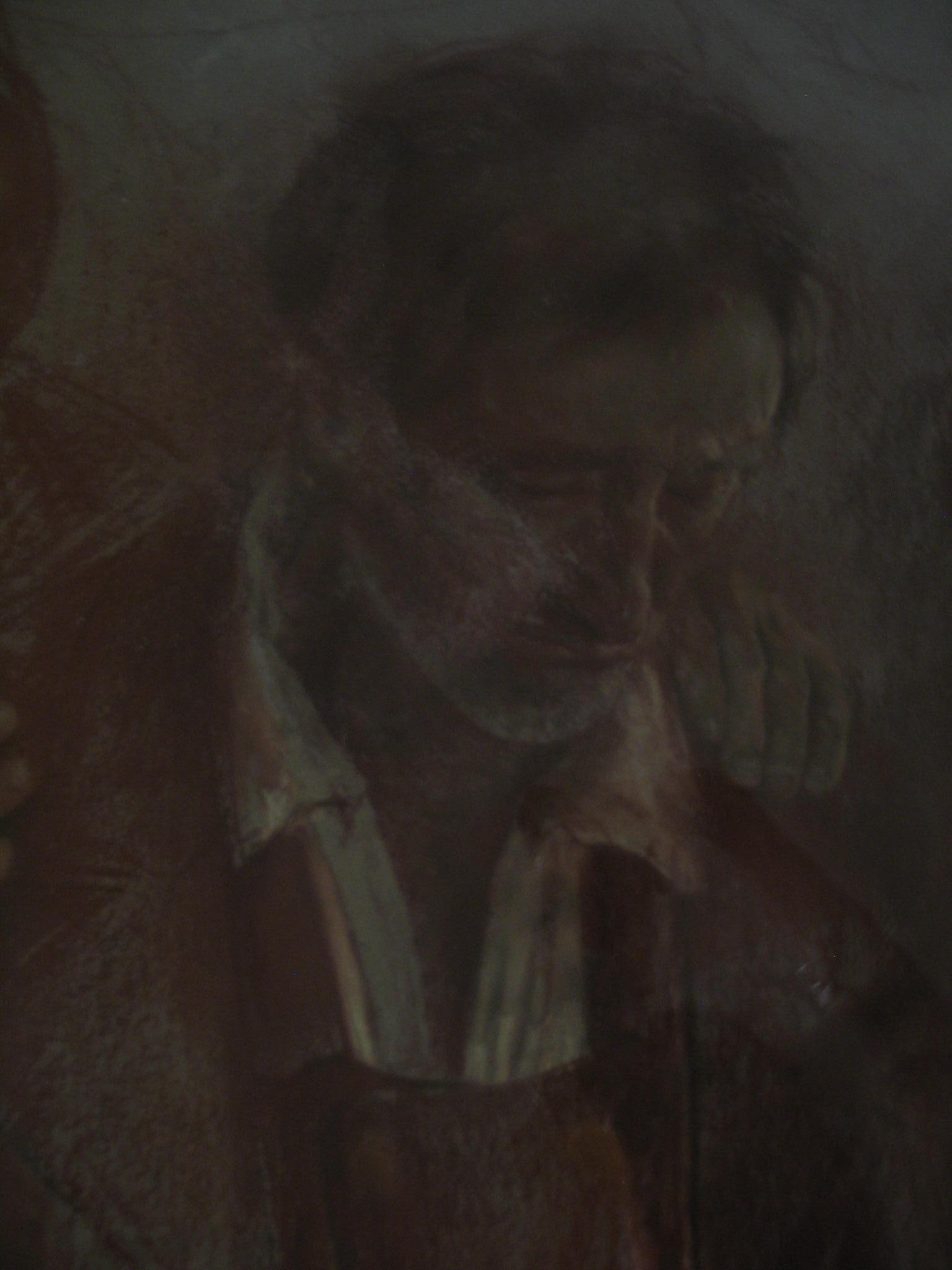 Questo dipinto rappresenta il dolore di un uomo accompagnato da due donne, una giovane, con viso e sguardo proiettati verso il futuro, e una anziana, che lo sostiene mestamente. L’atmosfera è di estrema sofferenza. Non servono parole: tutto è già reso esplicito dall’atmosfera e dai protagonisti, in un dialogo muto tra di loro. I colori stessi, tra il rosso, il bordeaux, il marrone, rendono ancora più cupa l’atmosfera. I tratti sono segnati, marcati con una certa violenza formale, incisivi, anche su volti eccessivamente magri e scavati, come quello dell’uomo
