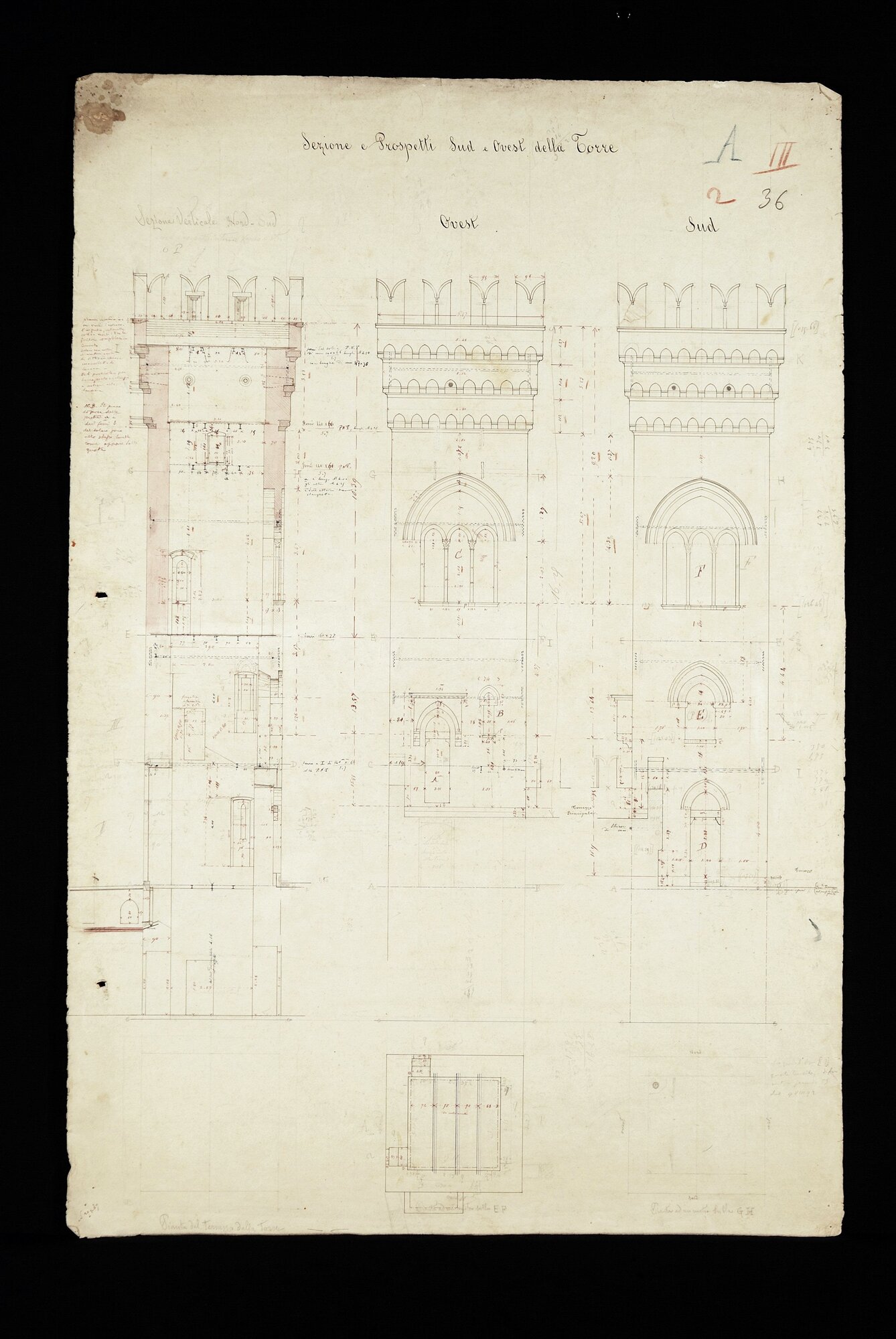 Sezione nord-sud e prospetti ovest e sud, con piante di riferimento, della torre centrale con la posizione delle travi in ferro