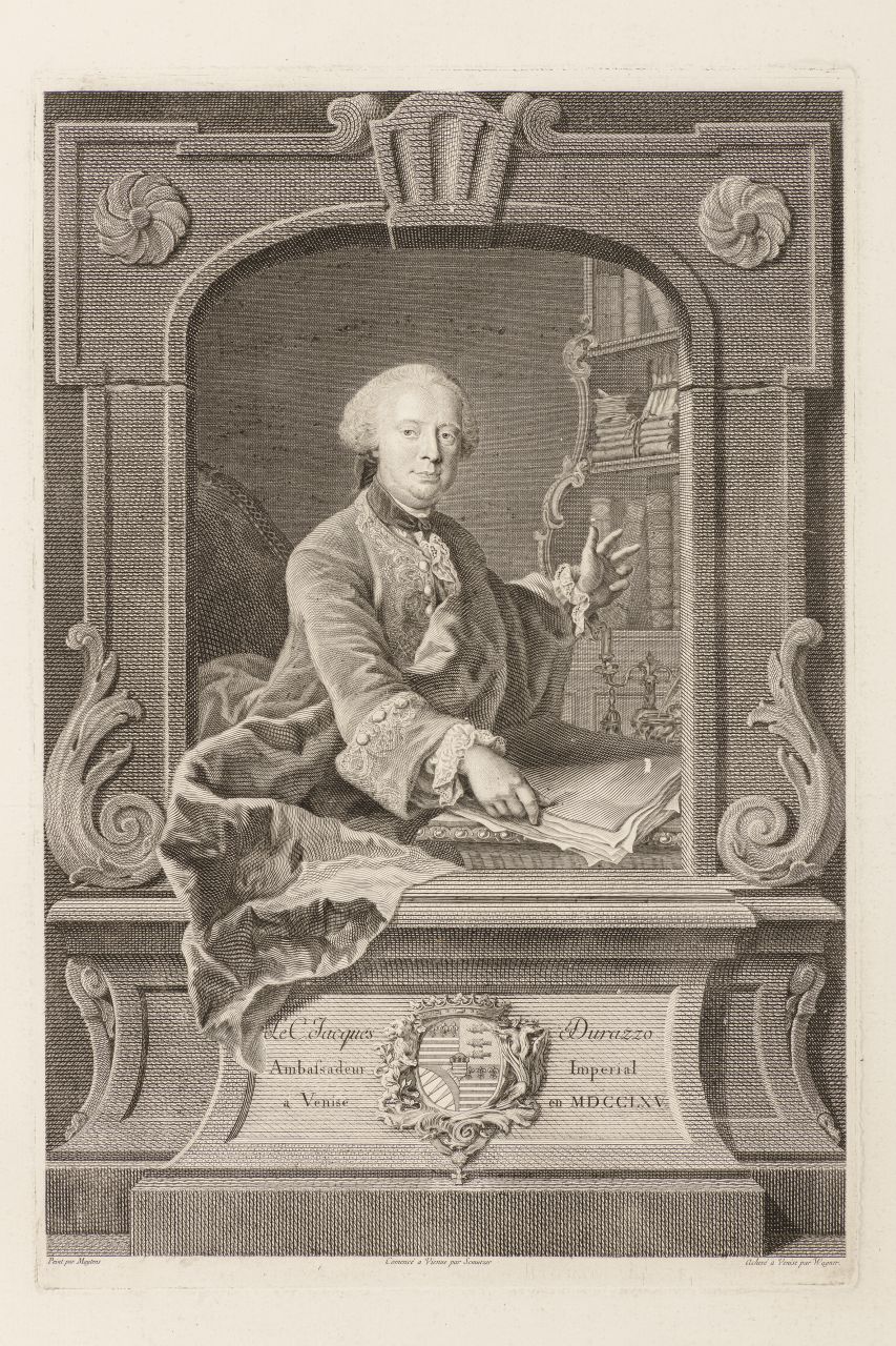 - NOTIZIE STORICO CRITICHE La stampa, che celebra la nuova carica di ambasciatore cesareo del conte, raffigurato con i tipici attributi del bibliofilo e connoisseur, venne commissionata dal Durazzo a Jacob-Matthias Schmutzer a Vienna, ma completata a Venezia da Joseph Wagner per motivi non del tutto chiari. Risulta, però, plausibile l'ipotesi ventilata già da Brown, e ripresa da Ivaldi e Maffioli, che il cambio di mano possa essere da mettersi in relazione con le dimissioni forzate del Durazzo dalla carica di Generalspektakeldirektor, in seguito allo scandalo della sua relazione con la ballerina francese Louise Joffroy Bodin (Brown, 1997; Ivaldi e Maffioli, 2004). Risulta evidente, come sottolineato anche dall'iscrizione in calce, il debito della stampa nei confronti del dipinto raffigurante il conte e la consorte ad opera di Martin van Meytens il giovane, oggi nelle collezioni del Metropolitan Museum of Arts (inv. 50.50) a cui lo Schmutzer doveva aver avuto accesso diretto nella realizzazione delle versioni preliminari della stampa, oggi conservate nel gabinetto di disegni e stampe dell’Albertina di Vienna (inv. D/I/58/41)