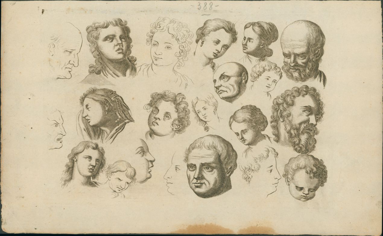 - NOTIZIE STORICO CRITICHE L’acquaforte in esame, che raffigura modelli di volti in diverse posizioni ed espressioni, faceva parte di un album di tavole didattiche concepite come repertorio per l’apprendimento del disegno. La tavola propone particolari anatomici isolati, destinati a esercizi di copia e studio da parte di allievi e artisti, secondo una tipologia di materiali molto diffusa in età moderna. La produzione dell’album si colloca nell’ambito centro-italiano tra XVIII e XIX secolo, quando simili repertori grafici ebbero larga circolazione nelle scuole e nelle accademie di belle arti. Nell’inventario compilato nel 1923 da Don Francesco Rosso, relativo al nucleo della collezione Durazzo confluito nell’Istituto Salesiano San Carlo di Borgo San Martino e ricordato da Natale Maffioli (1999), è attestata la presenza del volume "Regole per imparar a disegnar i corpi humani...", delineato da Giacomo Palma il Giovane e pubblicato a Venezia nel 1636. Sebbene il foglio qui conservato non sia una derivazione diretta da quell’opera, la sua natura e funzione didattica testimoniano l’interesse dei Durazzo per repertori grafici di questo genere e documentano la fortuna e la persistenza, ancora in età moderna, di modelli a stampa destinati allo studio del corpo umano e delle proporzioni