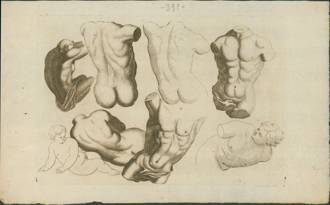 - NOTIZIE STORICO CRITICHE L’acquaforte in esame, che raffigura modelli di busti in diverse angolazioni e posizioni, faceva parte di un album di tavole didattiche concepite come repertorio per l’apprendimento del disegno. La tavola propone particolari anatomici isolati, destinati a esercizi di copia e studio da parte di allievi e artisti, secondo una tipologia di materiali molto diffusa in età moderna. La produzione dell’album si colloca nell’ambito centro-italiano tra XVIII e XIX secolo, quando simili repertori grafici ebbero larga circolazione nelle scuole e nelle accademie di belle arti. Nell’inventario compilato nel 1923 da Don Francesco Rosso, relativo al nucleo della collezione Durazzo confluito nell’Istituto Salesiano San Carlo di Borgo San Martino e ricordato da Natale Maffioli (1999), è attestata la presenza del volume "Regole per imparar a disegnar i corpi humani...", delineato da Giacomo Palma il Giovane e pubblicato a Venezia nel 1636. Sebbene il foglio qui conservato non sia una derivazione diretta da quell’opera, la sua natura e funzione didattica testimoniano l’interesse dei Durazzo per repertori grafici di questo genere e documentano la fortuna e la persistenza, ancora in età moderna, di modelli a stampa destinati allo studio del corpo umano e delle proporzioni