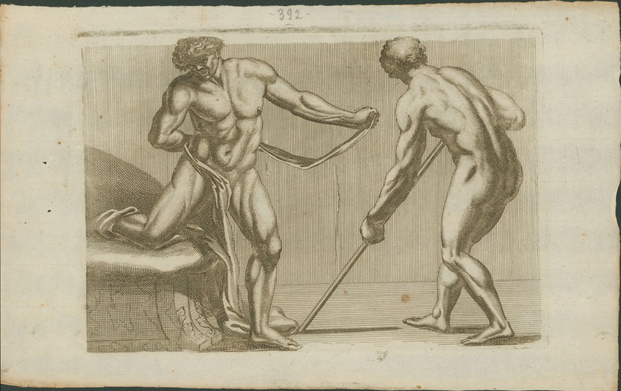 - NOTIZIE STORICO CRITICHE L’acquaforte in esame, che raffigura due nudi maschili, faceva parte di un album di tavole didattiche concepite come repertorio per l’apprendimento del disegno. La tavola propone figure intere, trattate secondo un’impostazione classicheggiante e con attenzione alla resa anatomica e plastica, destinate a esercizi di copia e studio da parte di allievi e artisti, secondo una tipologia di materiali molto diffusa in età moderna. La produzione dell’album si colloca nell’ambito centro-italiano tra XVIII e XIX secolo, quando simili repertori grafici ebbero larga circolazione nelle scuole e nelle accademie di belle arti. Nell’inventario compilato nel 1923 da Don Francesco Rosso, relativo al nucleo della collezione Durazzo confluito nell’Istituto Salesiano San Carlo di Borgo San Martino e ricordato da Natale Maffioli (1999), è attestata la presenza del volume "Regole per imparar a disegnar i corpi humani...", delineato da Giacomo Palma il Giovane e pubblicato a Venezia nel 1636. Sebbene il foglio qui conservato non sia una derivazione diretta da quell’opera, la sua natura e funzione didattica testimoniano l’interesse dei Durazzo per repertori grafici di questo genere e documentano la fortuna e la persistenza, ancora in età moderna, di modelli a stampa destinati allo studio del corpo umano e delle proporzioni