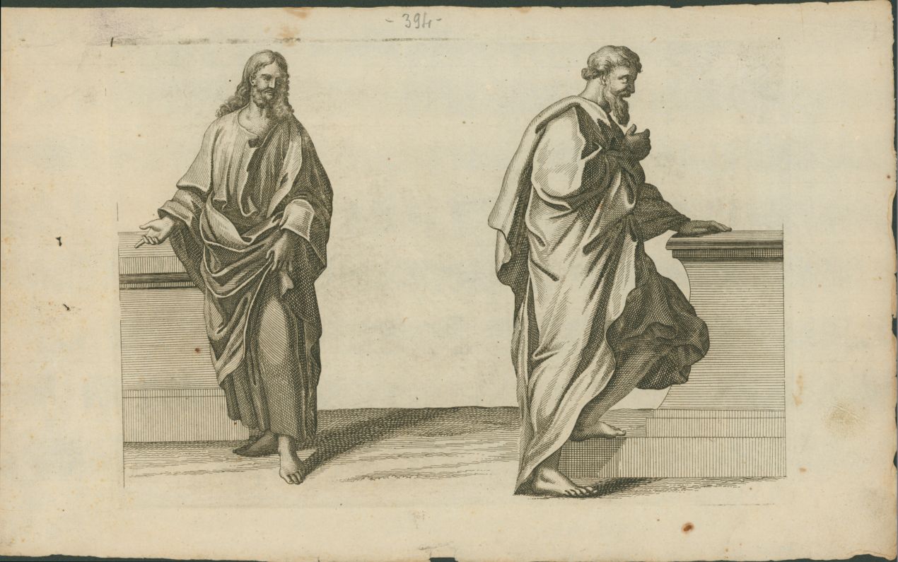 - NOTIZIE STORICO CRITICHE L’acquaforte in esame, che raffigura due figure maschili stanti, interamente drappeggiate e rese con pose solenni, faceva parte di un album di tavole didattiche concepite come repertorio per l’apprendimento del disegno. La tavola propone modelli a figura intera, con particolare attenzione alla resa dei panneggi e della gestualità, destinati a esercizi di copia e studio da parte di allievi e artisti, secondo una tipologia di materiali molto diffusa in età moderna. La produzione dell’album si colloca nell’ambito centro-italiano tra XVIII e XIX secolo, quando simili repertori grafici ebbero larga circolazione nelle scuole e nelle accademie di belle arti. Nell’inventario compilato nel 1923 da Don Francesco Rosso, relativo al nucleo della collezione Durazzo confluito nell’Istituto Salesiano San Carlo di Borgo San Martino e ricordato da Natale Maffioli (1999), è attestata la presenza del volume "Regole per imparar a disegnar i corpi humani...", delineato da Giacomo Palma il Giovane e pubblicato a Venezia nel 1636. Sebbene il foglio qui conservato non sia una derivazione diretta da quell’opera, la sua natura e funzione didattica testimoniano l’interesse dei Durazzo per repertori grafici di questo genere e documentano la fortuna e la persistenza, ancora in età moderna, di modelli a stampa destinati allo studio del corpo umano e delle proporzioni