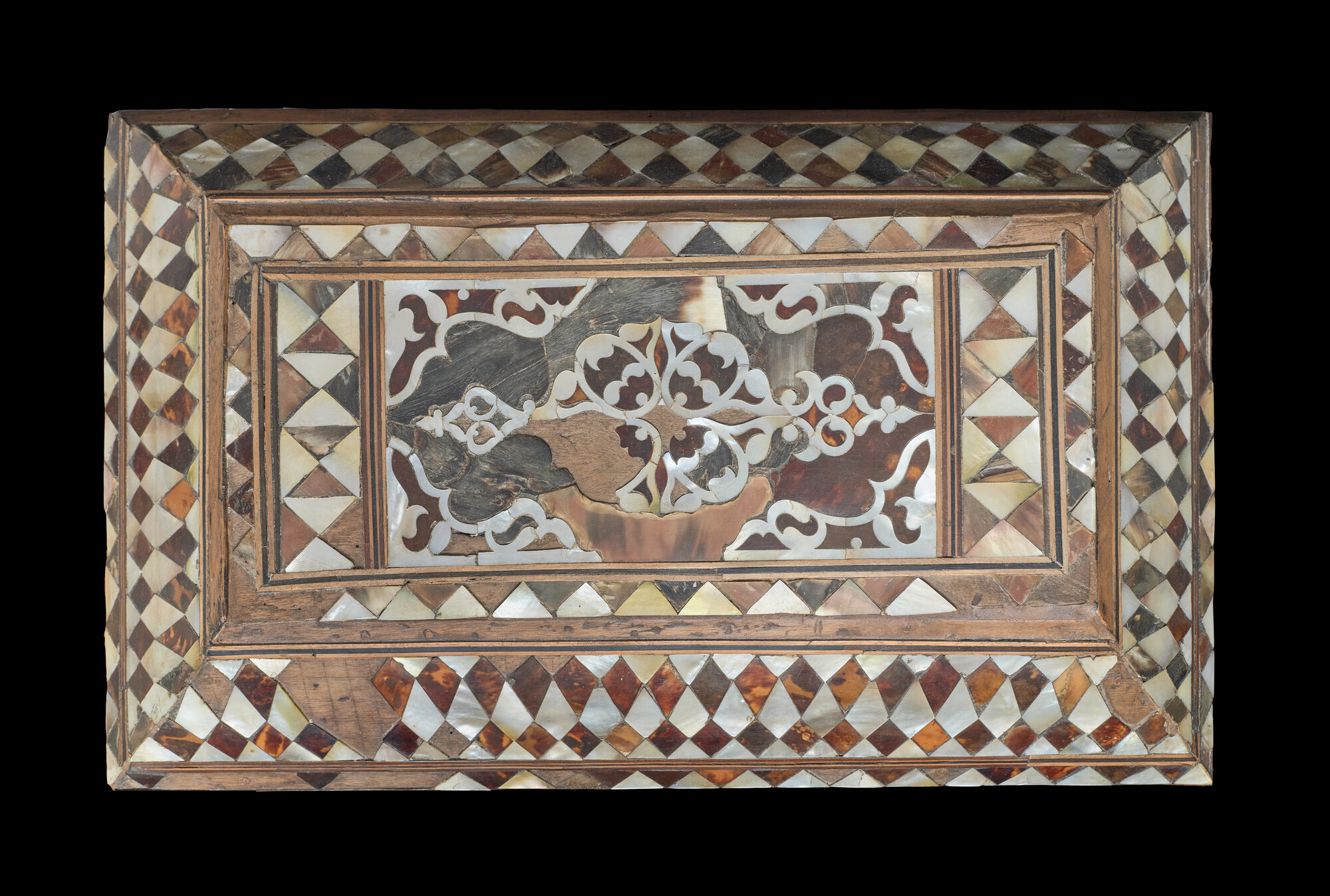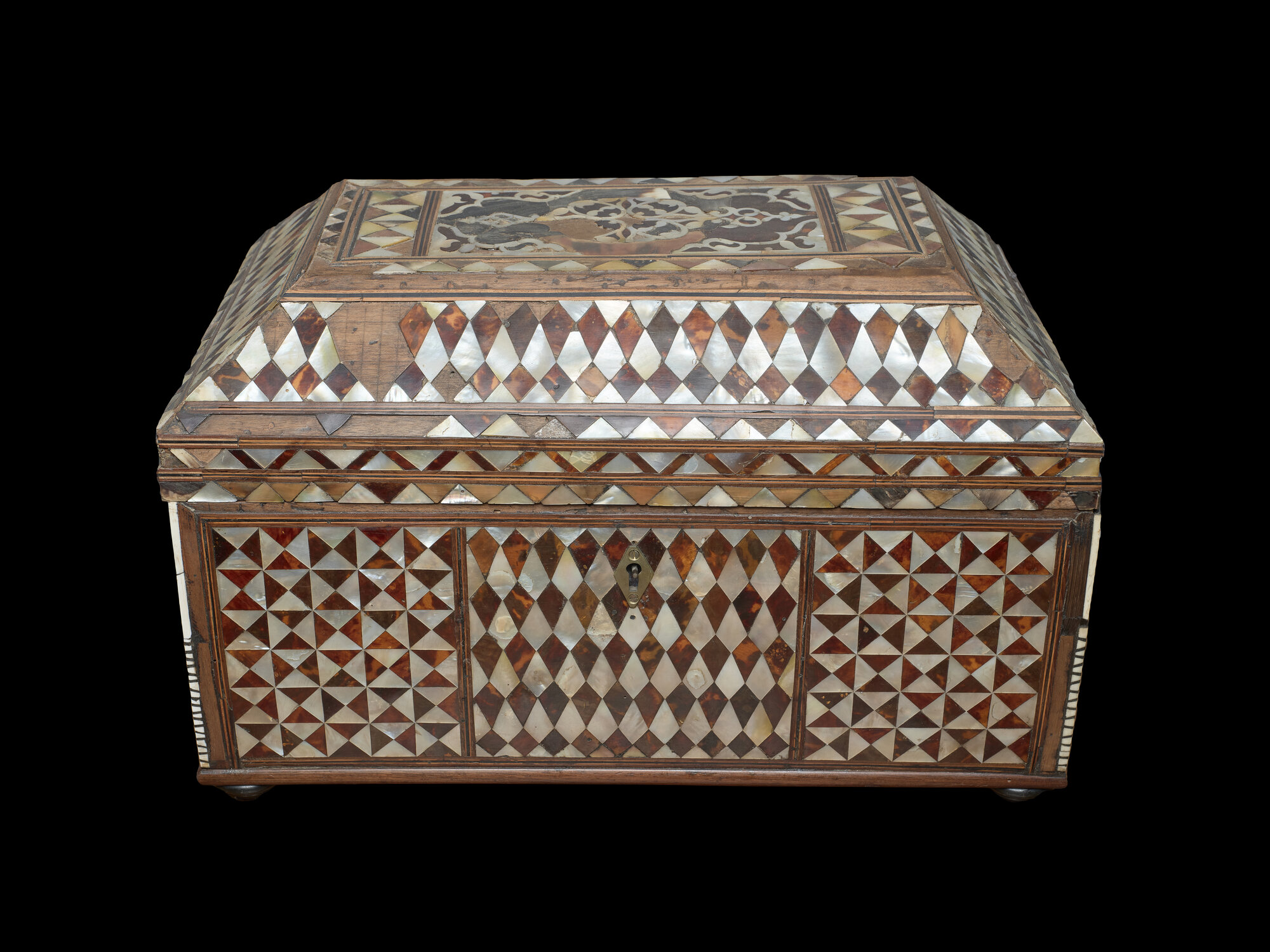 - NOTIZIE STORICO CRITICHE Il cofanetto rientra in un tipo di produzione assai diffusa in ambito ottomano tra XVII e XIX secolo. Una decorazione analoga, sia per l’impianto del disegno, ispirato a modelli geometrici di gusto islamico, sia per l’utilizzo di madreperla e tartaruga alternati, caratterizzava anche i piccoli tavoli da scrittura turchi, come l’esemplare seicentesco del British Museum (inv. 1991, 0717.2). Esistono numerosi cofanetti assai simili a quello in oggetto, per la maggior parte datati al XVIII secolo, come, ad esempio, un pezzo del Museo Benaki (inv. ΓΕ 34044) proveniente dall’Asia Minore e usato anche come contenitore di ostie per la Messa. Vari cofanetti dello stesso genere sono diffusi sul mercato antiquario; tra questi si può citare un pezzo passato da Christie’s in un’asta presso la Galerie Gismondi di Parigi del 12 marzo 2024, che si differenzia dall’opera del Castello solo per l’assenza dei piedini, che però, anche in considerazione della loro forma molto diversa rispetto a quella dei sostegni presenti sugli altri cofani, potrebbero essere frutto di un’aggiunta posteriore