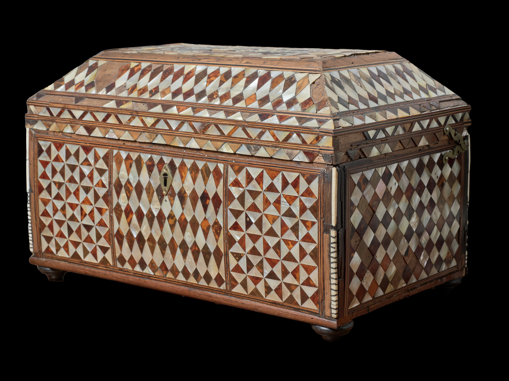 Il cofanetto, a sezione rettangolare e con coperchio troncopiramidale, poggia su quattro piedini a cipolla. Le superfici esterne, ripartire in scomparti quadrangolari da sottili cornici lignee, sono interamente rivestite da tessere in madreperla e in tartaruga, alternate tra loro, di forma triangolare o romboidale, con le quali sono realizzate composizioni geometriche ben diversificate in ognuno degli scomparti. Sul fronte è fissata una serratura in metallo con bocchetta romboidale