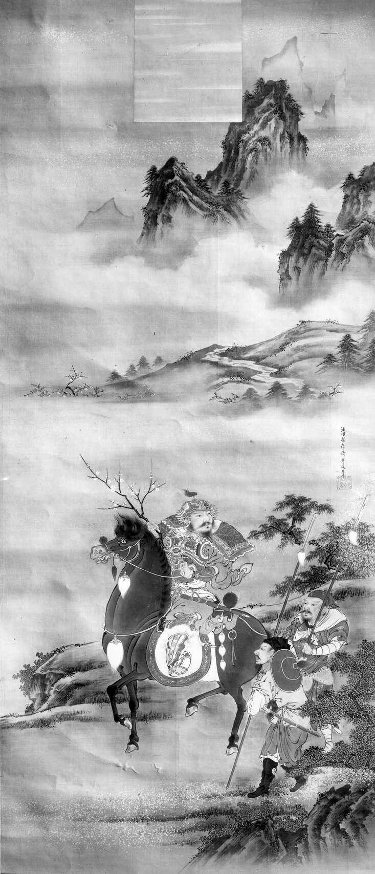 Dipinto con montatura yamato raffigurante un cavaliere cinese in un pianoro scortato da due fanti con lancia. Sullo sfondo si inerpica un paesaggio che emerge tra la bruma e culmina in una serie di picchi montuosi