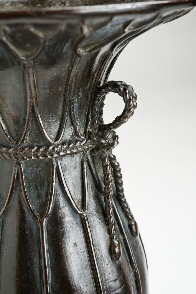 Vaso d'altare zun con piede svasato, corpo a bottiglia e bocca a tromba. L'oggetto è modellato come se fosse una foglia di loto ripiegata e legata al collo con una doppia corda, annodata ai lati in modo che formi due asole che costituiscono la presa