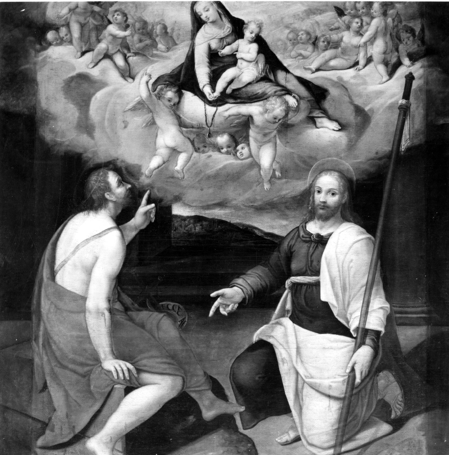 Alla destra è inginocchiato San Giacomo, in veste gialla e verde, con il bastone nella mano sinistra. Alla sinistra è il Battista, vicino al quale è visibile la parte del cartiglio, in mantello rosso, seduto, con il capo volto in alto a guardare l'apparizione della Vergine con Bambino, del quale stringe un piedino, in gloria di angeli, ove posa la visione celeste. Paesaggio nel fondo